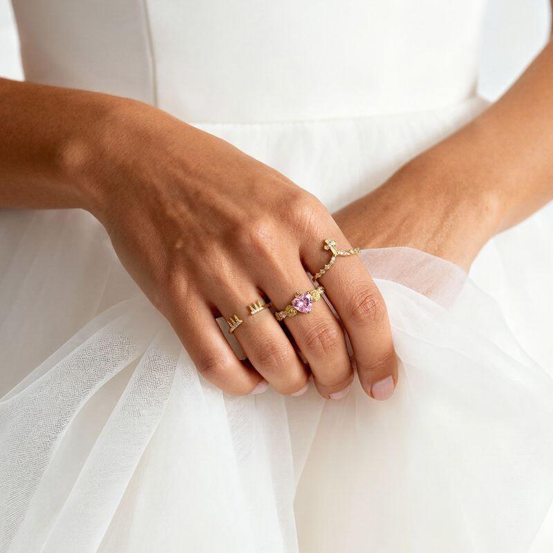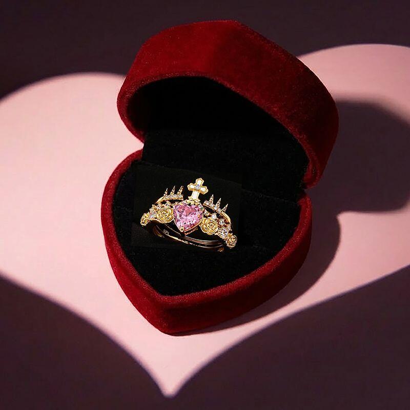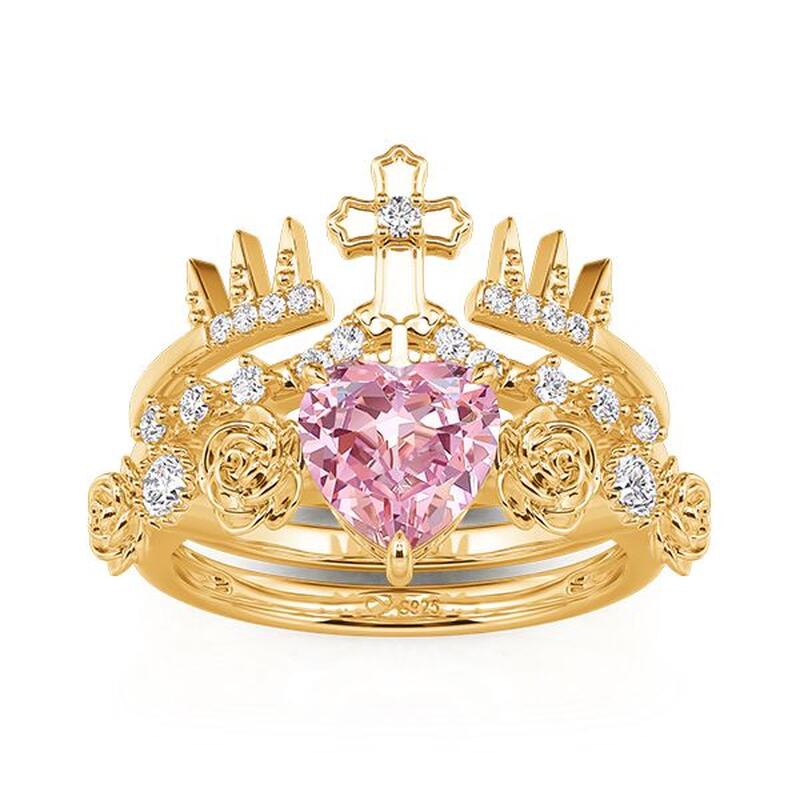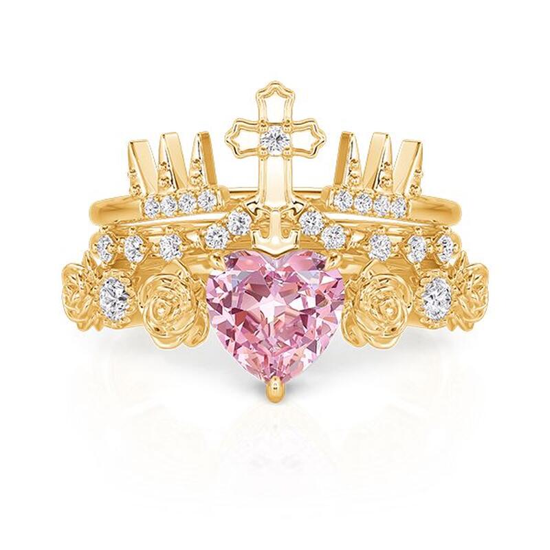 A dainty golden crown holds a soft pink heart, topped with a delicate cross that speaks of grace and quiet strength; wear this Jeulia crown ring as a solo statement or layered with simpler bands—a regal yet tender reminder that love is both a sanctuary and a source of fearless light.