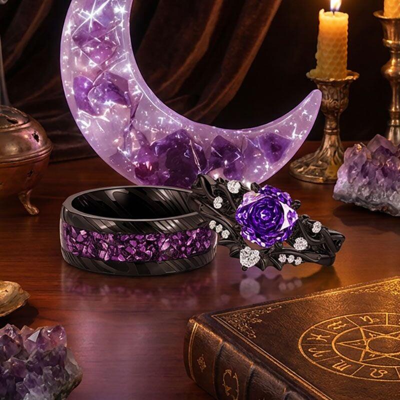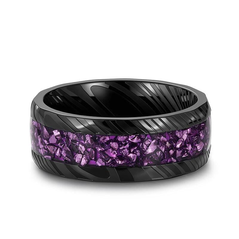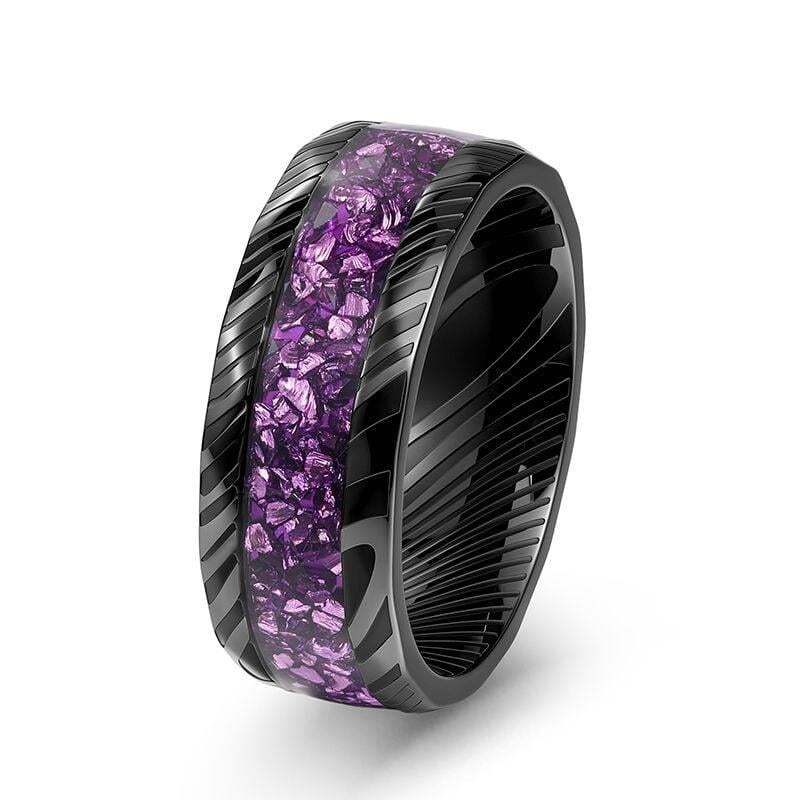 This rugged men’s ring from Jeulia combines industrial edge with bold color, crafted from durable black stainless steel with a distinctive hammered and striped texture across the band. A wide inlay of crushed purple stone fragments runs along the center, catching light to create a shimmering contrast against the dark metal. The angular, geometric edges add modern appeal, while the stainless steel construction ensures long-lasting wear and scratch resistance. Ideal for everyday use or special occasions, this purple ring blends rugged durability with vibrant style—a thoughtful choice for birthdays, anniversaries, or any milestone worth celebrating.