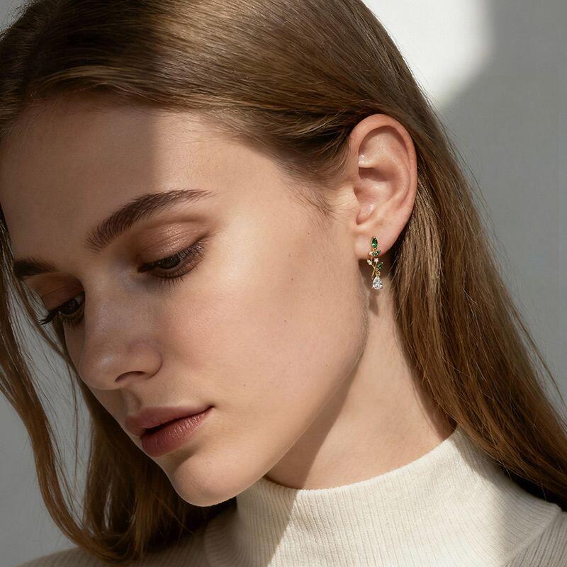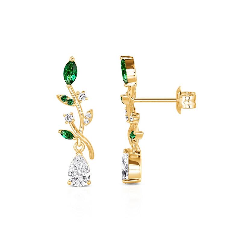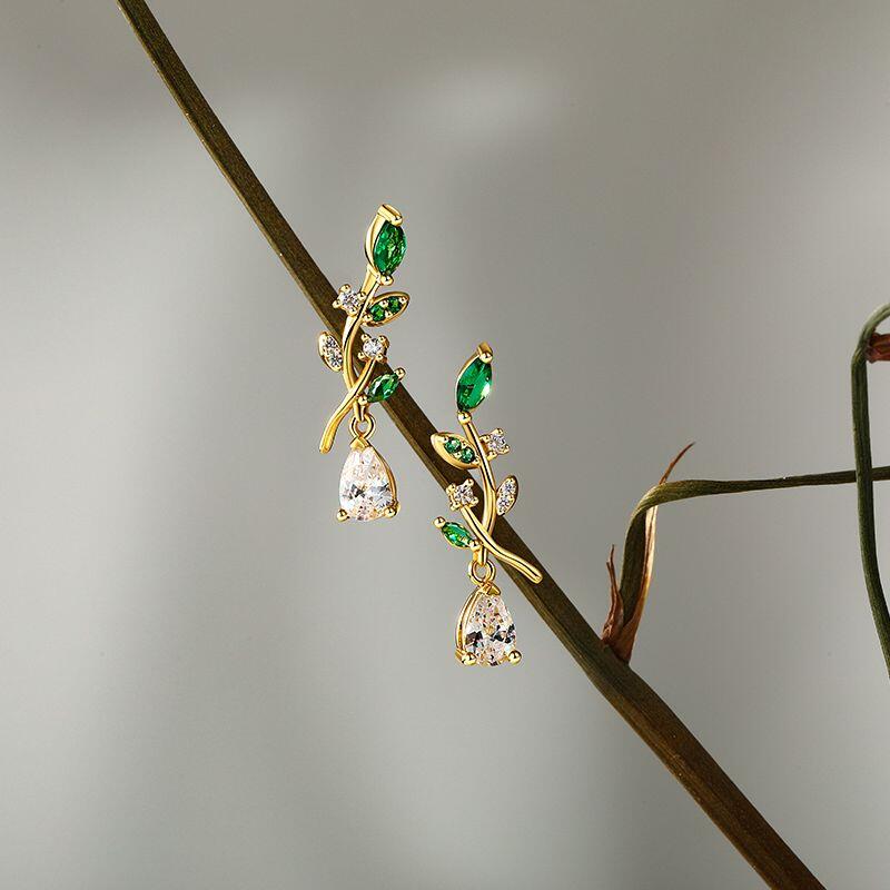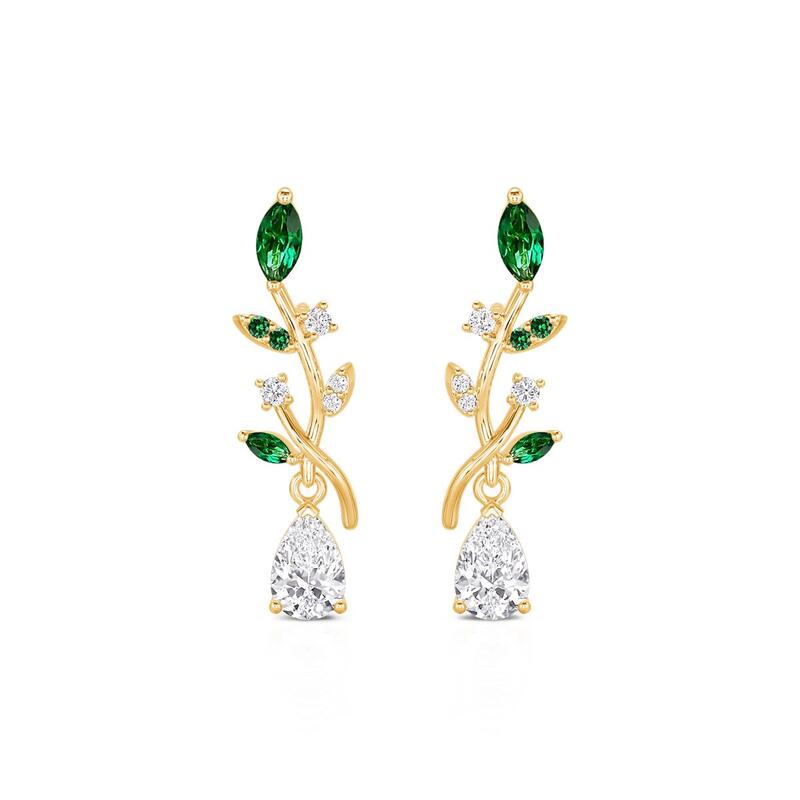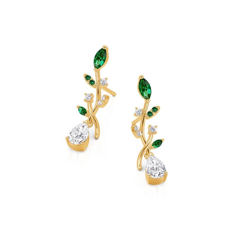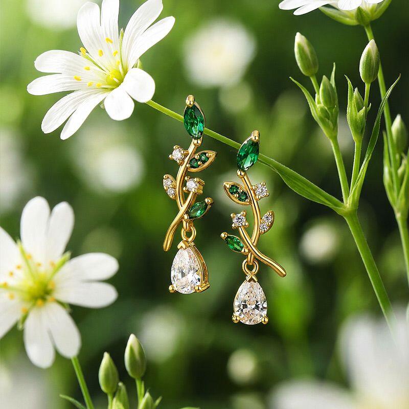 Golden vines twist around teardrop green stones, ending in a single clear gem that sways like dew about to fall—these Jeulia leaf earrings capture the wild elegance of a midsummer forest, where light filters through leaves and every movement feels like a whispered secret from nature’s own jewelry box.