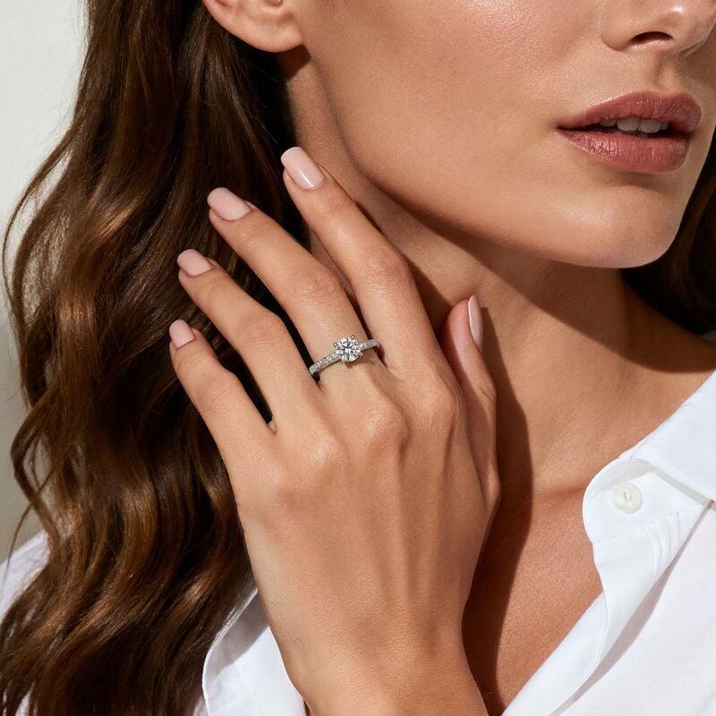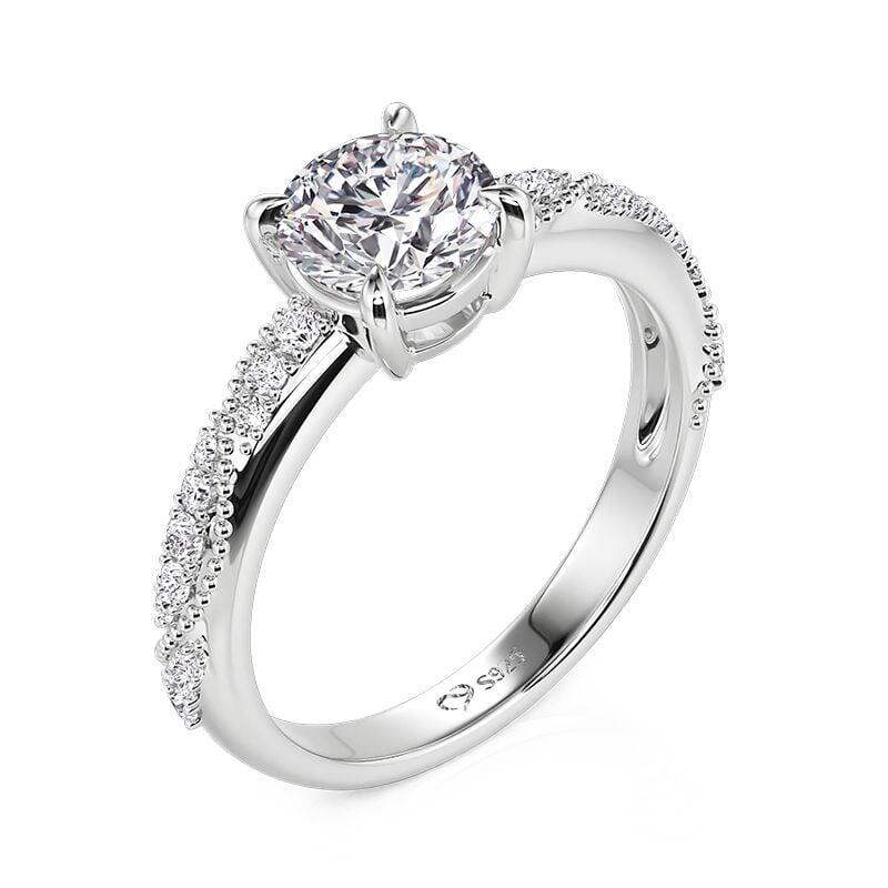 This elegant milgrain engagement ring from Jeulia centers on a brilliant round-cut stone set in a classic four-prong mount. Flowing along the band, milgrain beading forms a delicate wave pattern, with sparkling pavé stones tracing softly on either side. The vintage-inspired wave-shaped beadwork adds texture and refinement, beautifully balanced by the clean silhouette of polished sterling silver. Timeless in spirit yet distinctly detailed, this vintage ring offers a meaningful choice for engagements, anniversaries, or everyday wear.