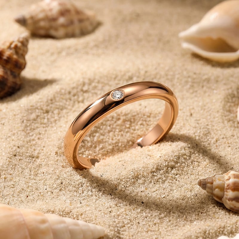 This sleek men's wedding band from Jeulia embodies understated modern elegance, crafted in warm rose gold with a polished, domed profile for a timeless, comfortable fit. A single brilliant round-cut stone is flush-set at the center, adding subtle luminosity without overwhelming the minimalist design. The smooth, high-shine finish enhances the rose gold's warm tone, while the flush setting ensures durability for everyday wear. Perfect for grooms who appreciate refined simplicity, this minimalist ring balances classic commitment with contemporary sophistication—ideal for weddings, anniversaries, or daily wear.