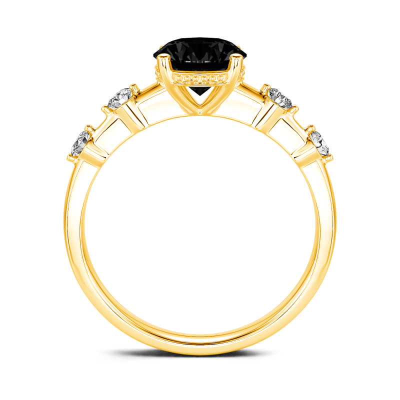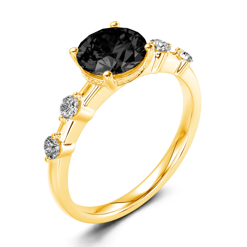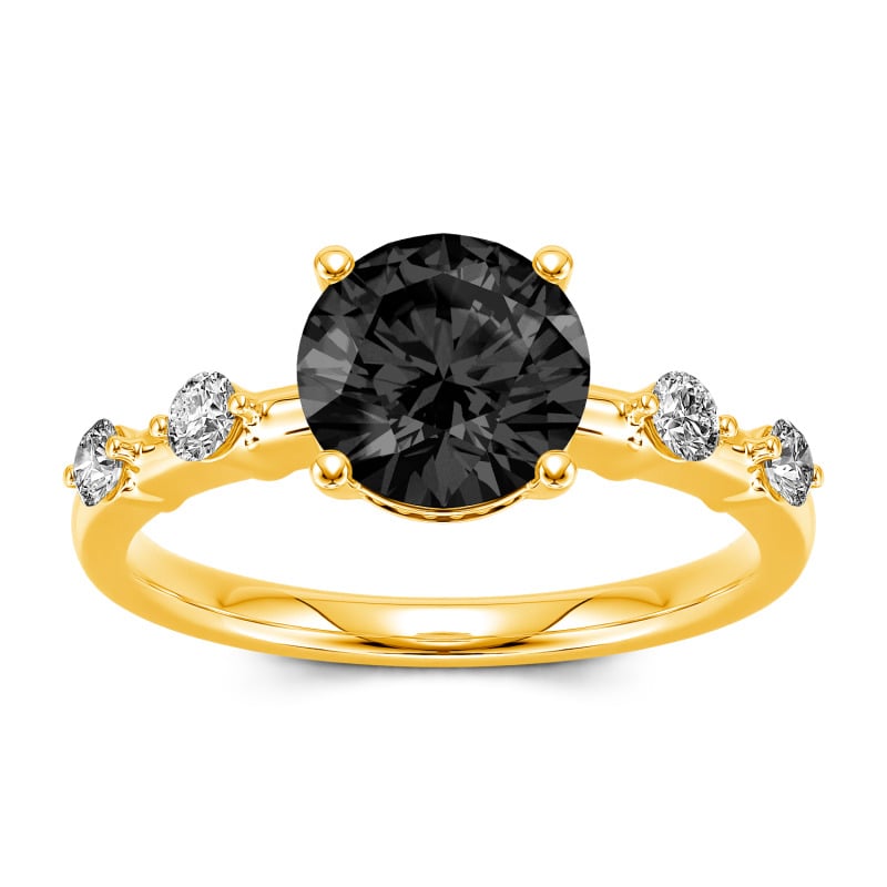 Unmatched in beauty and elegance, this round moissanite engagement ring is the bold look she's been dreaming of. An ultra thin shank is adorned with prong-set stones spaced elegantly half of the way around the band for a sophisticated and alluring look while lustrous bead prongs secure the center stone. So elegant it needs no further accompaniment, this ring is finished with a bright polished shine.