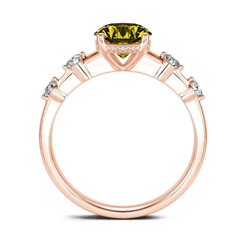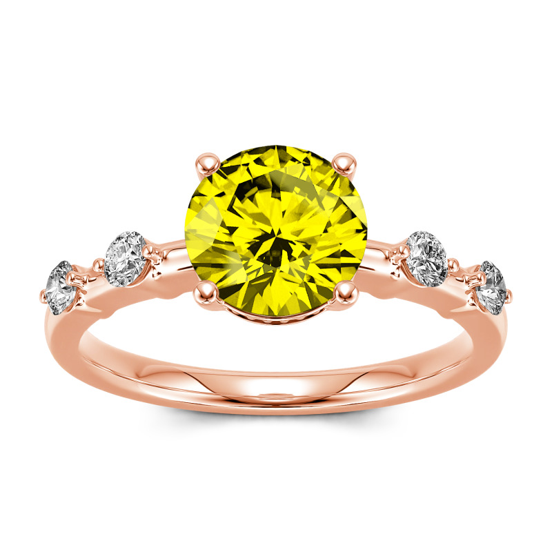 Unmatched in beauty and elegance, this round moissanite engagement ring is the bold look she's been dreaming of. An ultra thin shank is adorned with prong-set stones spaced elegantly half of the way around the band for a sophisticated and alluring look while lustrous bead prongs secure the center stone. So elegant it needs no further accompaniment, this ring is finished with a bright polished shine.