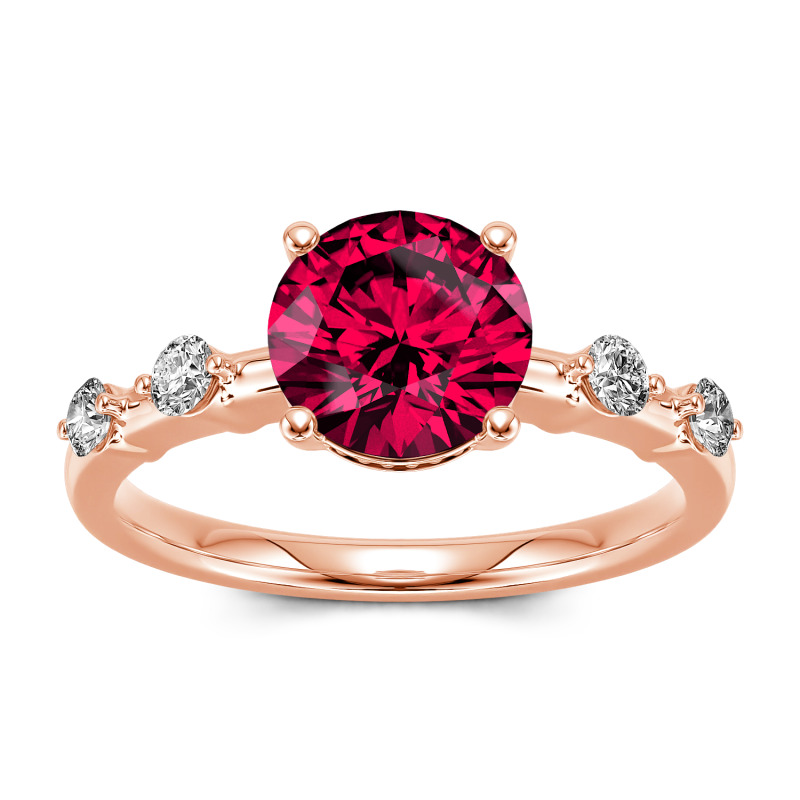 Unmatched in beauty and elegance, this round moissanite engagement ring is the bold look she's been dreaming of. An ultra thin shank is adorned with prong-set stones spaced elegantly half of the way around the band for a sophisticated and alluring look while lustrous bead prongs secure the center stone. So elegant it needs no further accompaniment, this ring is finished with a bright polished shine.