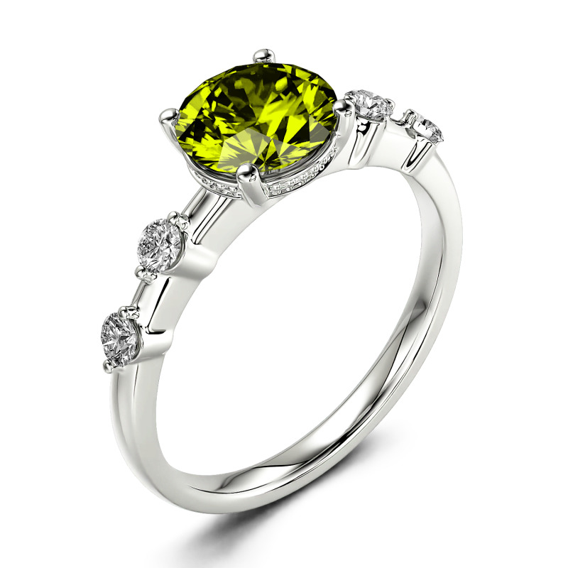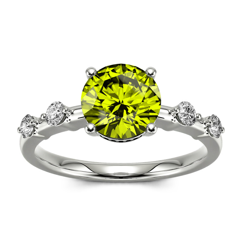 Unmatched in beauty and elegance, this round moissanite engagement ring is the bold look she's been dreaming of. An ultra thin shank is adorned with prong-set stones spaced elegantly half of the way around the band for a sophisticated and alluring look while lustrous bead prongs secure the center stone. So elegant it needs no further accompaniment, this ring is finished with a bright polished shine.
