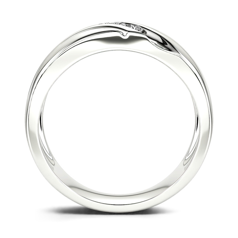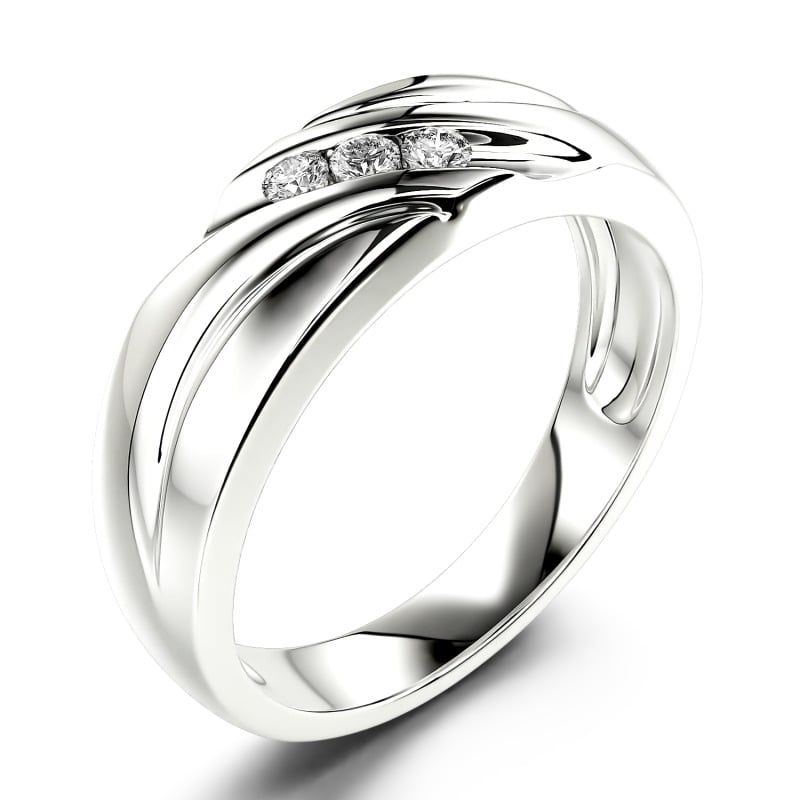 Contoured lines and a trio of moissanite flow along this handsome men's wedding band. This piece is highlighted by a diagonal stripe of three round stones adding a touch of eye-catching style. The perfectly polished finish, together with the striking shine of channel-set stones, is definitely a fashionable choice for him.