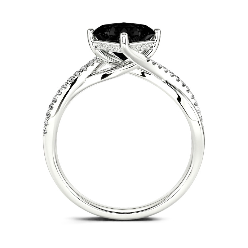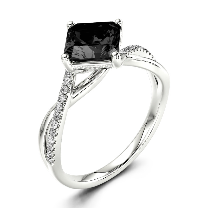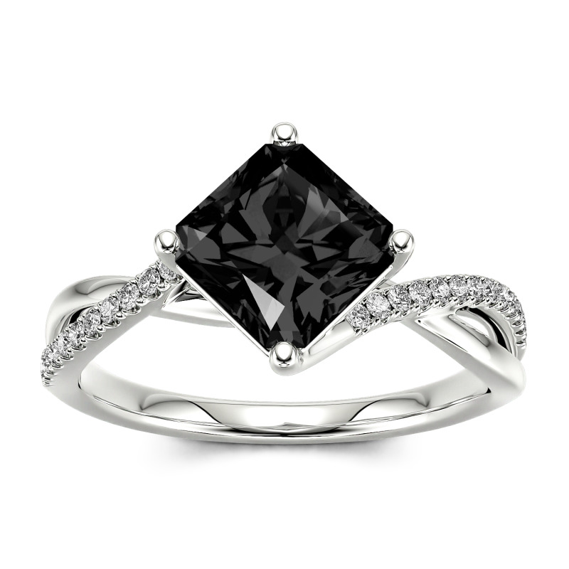 With divine style, this moissanite engagement ring shines with the beauty of your romance. This ring showcases a shimmering princess-cut center stone in a traditional four-prong setting.The polished and shimmering stone-lined ribbons of the shank surround the center in a smart twist design. Luxe and lovely, this engagement ring reflects the unique twists of turns of your romance.