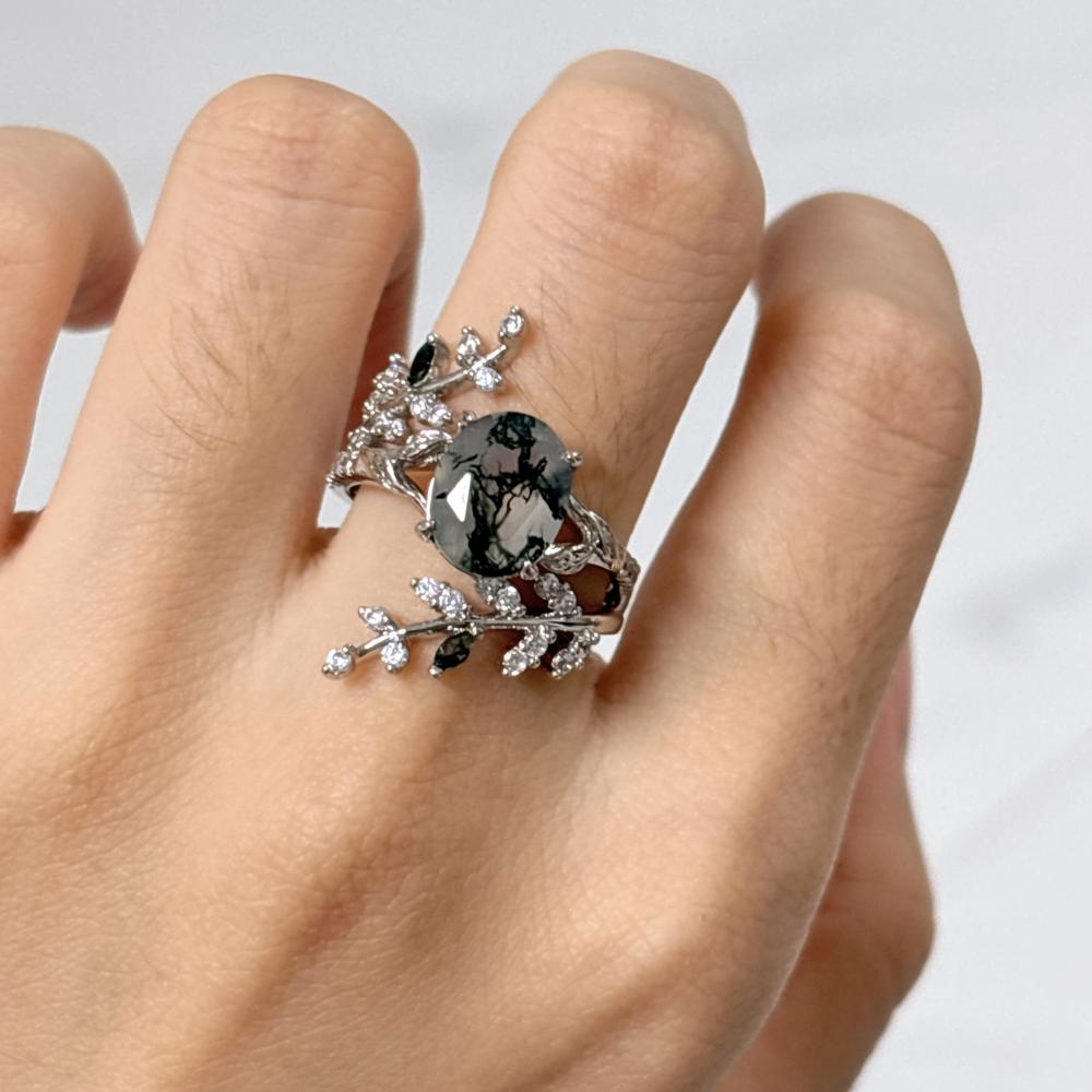 Jeulia Nature Inspired Vine Leaf Moss Agate Ring Set 2PCS