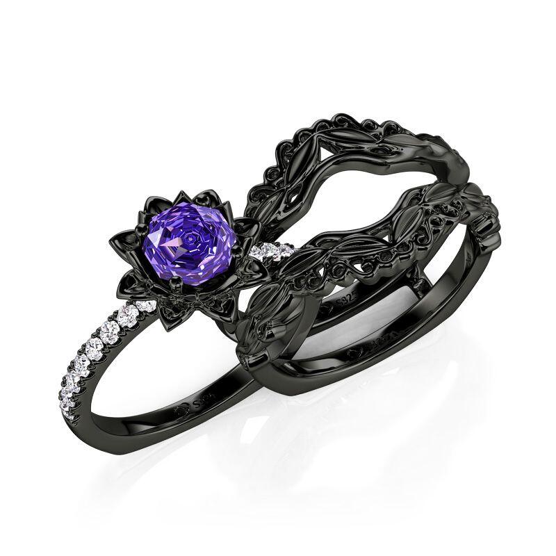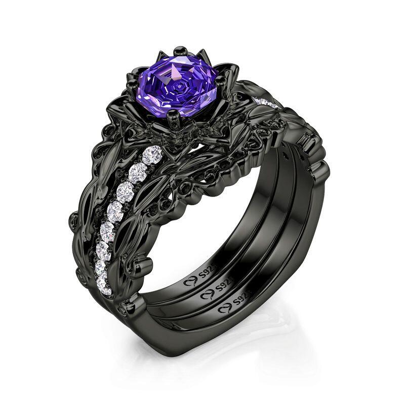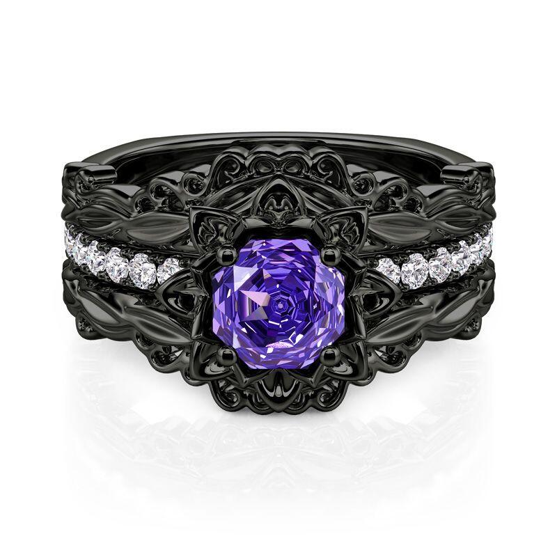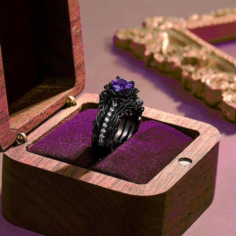 Immerse yourself in darkly romantic elegance with this Jeulia 2PCS black rose cut ring set. The collection is centered around a striking octagon rose-cut purple gem, enveloped by intricately crafted black-plated vine and floral motifs. One band anchors the vivid stone within a lush botanical setting, while the complementary sparkle-adorned vine band adds dimensional depth. When layered together, this black floral ring set creates a bold and captivating look that merges mysterious allure with sophisticated artistry.