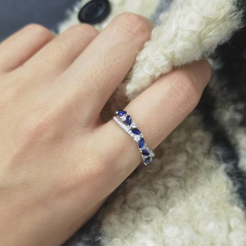 Olivetta’s signature cluster poetry unfolds: one silver strand twists with pavé white stones like frozen stardust, the other coils with marquise sapphires deep as twilight oceans. The bands mirror each other’s rhythm without touching—a silent duet of ice and shadow. Each stone sits flush, ignited by the twist’s motion. This Jeulia Olivetta Classic Twist Wedding Band is ideal for those who believe love thrives where contrasts dance, not clash.