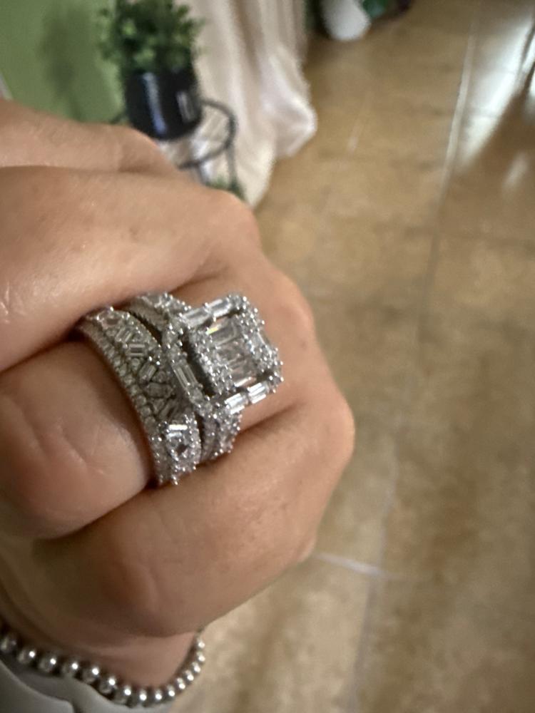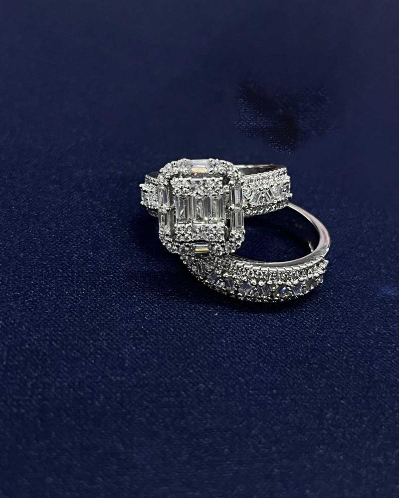 The Jeulia Olivetta Square Halo Engagement Ring Set is a stunning showcase of intricate design and elegance. The main ring features a striking square center stone, which is composed of multiple smaller stones, creating a captivating focal point. This center piece is further enhanced by a halo of smaller stones arranged in a cluster around it. Both the band of the engagement ring and the matching wedding band are designed with a beautiful cluster arrangement, adding depth and texture to the overall design. This cohesive pattern creates a sense of harmony between the two rings. This exquisite arrangement of stones in both the main ring and the accompanying band results in a luxurious and sophisticated look. Ideal for engagements or special occasions, the Jeulia Olivetta Eternity Ring Set is a timeless expression of love and commitment, making it a cherished addition to any jewelry collection.