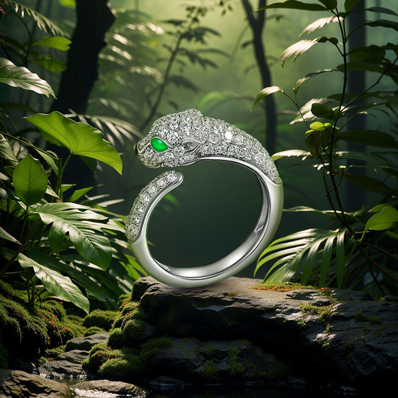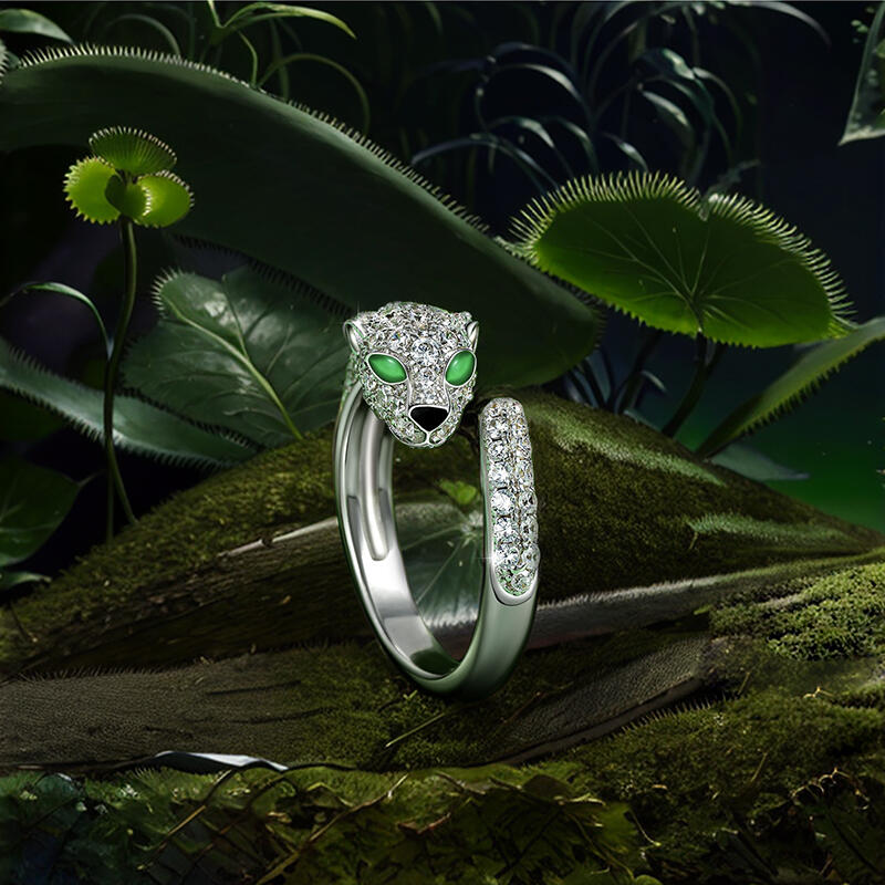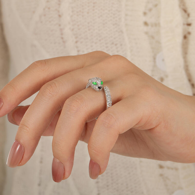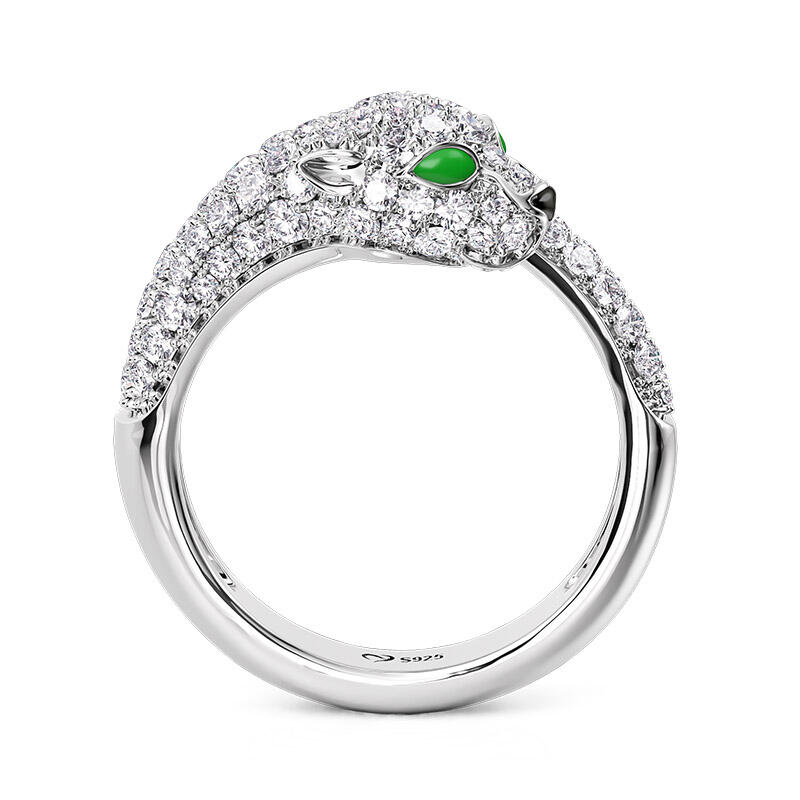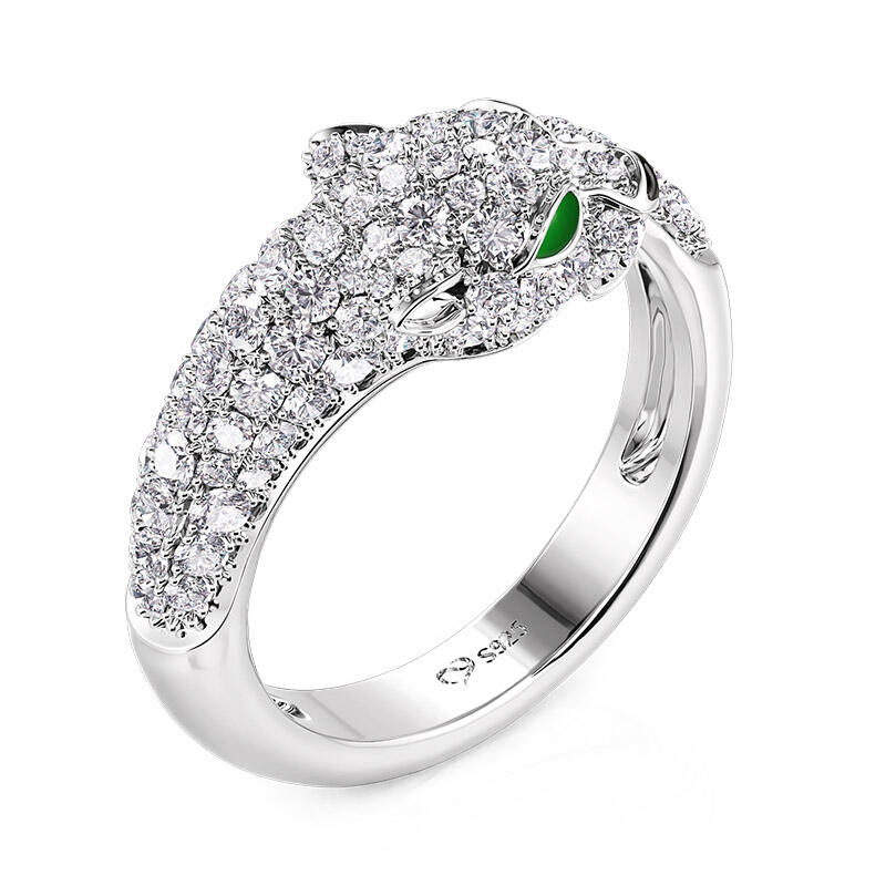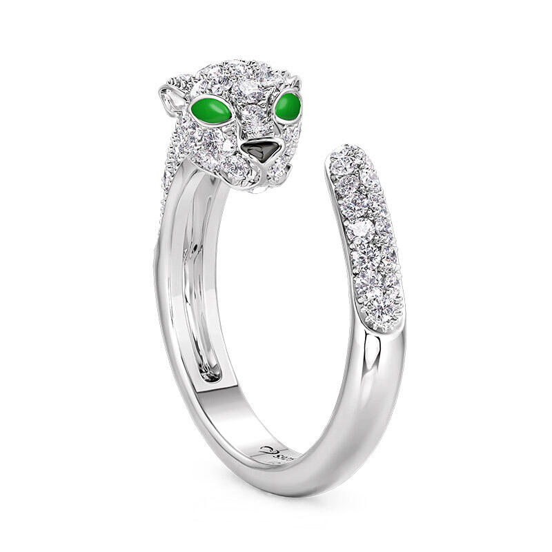 Inspired by the classic leopard's head, this open animal leopard ring is the perfect blend of wild glamour and refined craftsmanship. The body of the open ring is crafted in high shine white gold for a luxurious and modern feel. The leopard's head is set with sparkling round brilliant stones, whose delicate craftsmanship presents a realistic textured effect that gives this leopard ring a vivid personality. Particularly noteworthy is the use of vivid green gemstones for the leopard's eyes, creating a strong visual contrast and adding a touch of mystery and wildness. In addition, the animal ring's loop design is continued with smooth curves, simulating the elegant posture of the leopard. The arms of the sterling silver open ring are also studded with tiny diamonds, adding layers and splendor to the overall design.