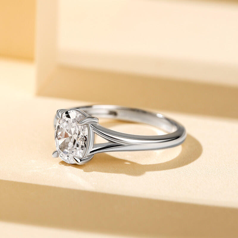 This moissanite ring has a graceful 4-claw setting, indulgently displaying its brilliance with a forever shining solitaire in the center stage. The vintage split shoulders lift the desirable oval-cut stone as you state the holy promises of unending love to her at the proposal. The classic design with the gracious look will stockpile your blessing moments and eternalize your love story.