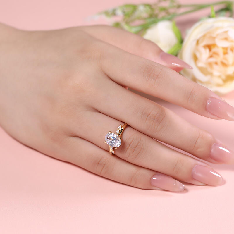 This ring features an elegant oval cut main stone that truly captivates the eye. Nestled gracefully in its setting, the main stone is enhanced by four small marquise cut stones. This combination of shapes creates a unique and fashionable design that is sure to turn heads. The overall design of this jewelry piece is both elegant and contemporary. Whether worn as a statement piece or paired with a simple ensemble, this jewelry is sure to make a lasting impression.