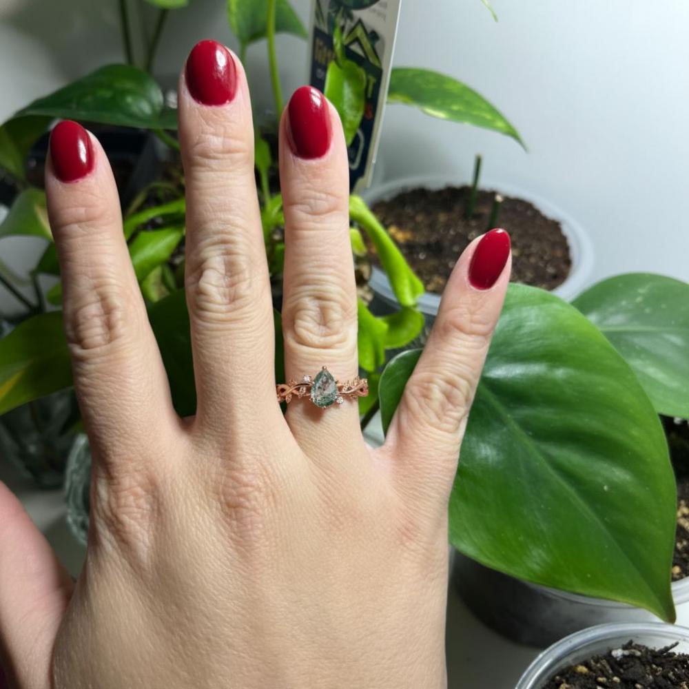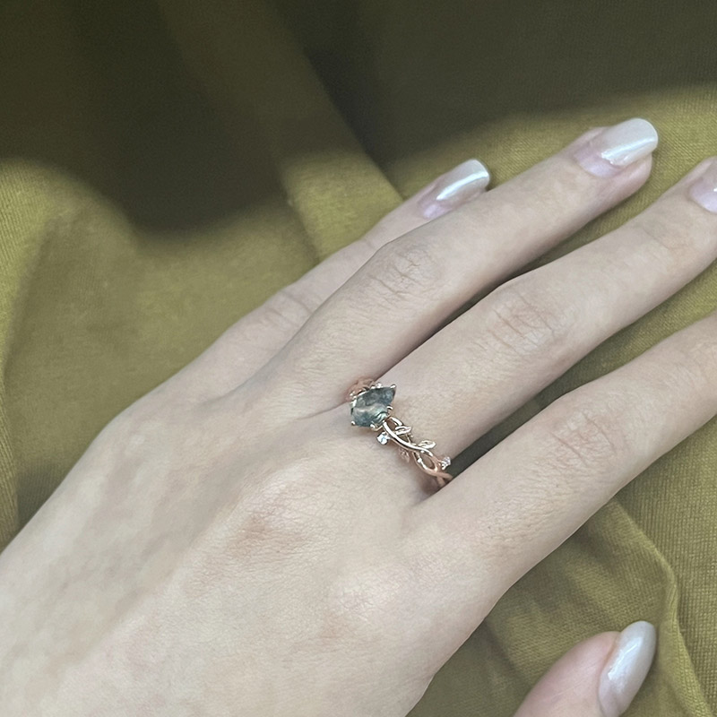 Jeulia Pear Cut Rose Gold Moss Agate Engagement Ring with Vine Leaf