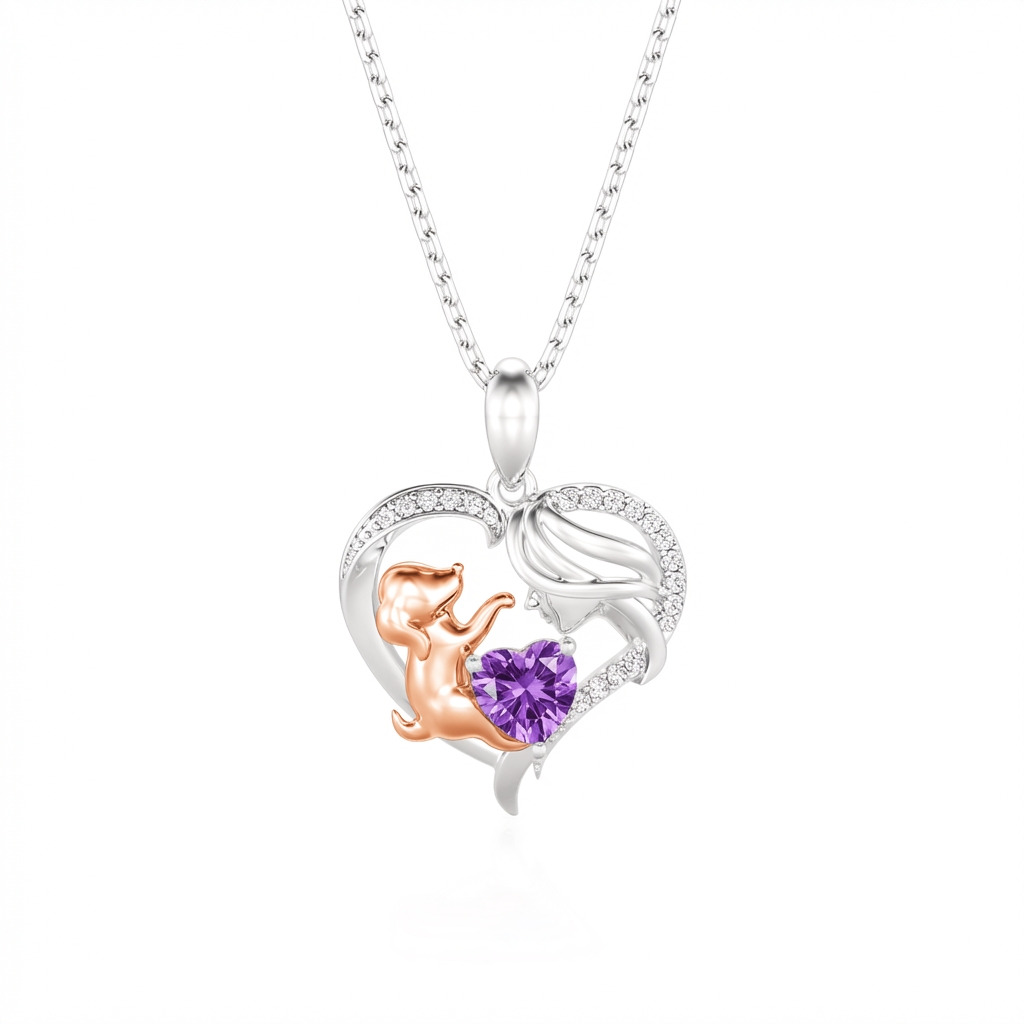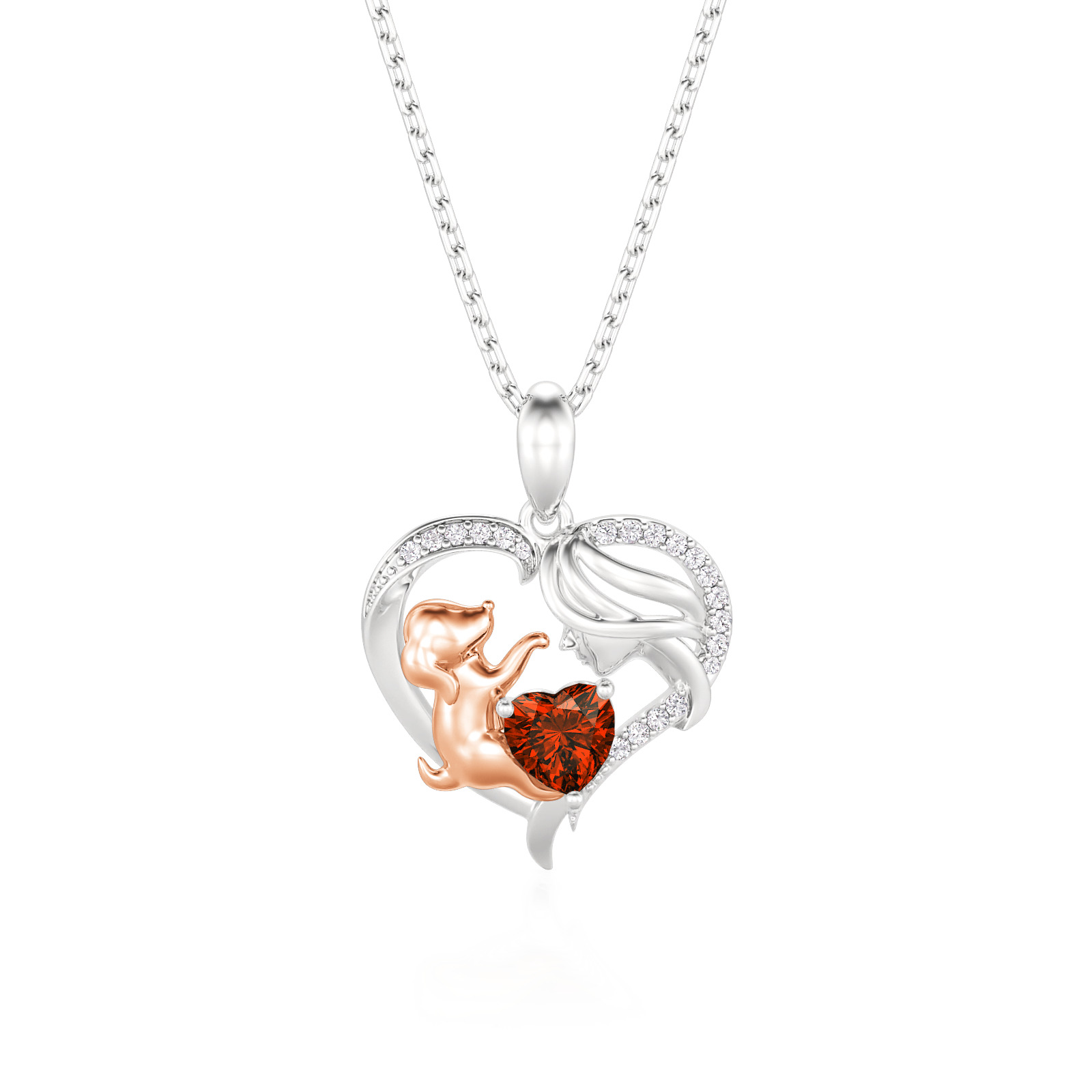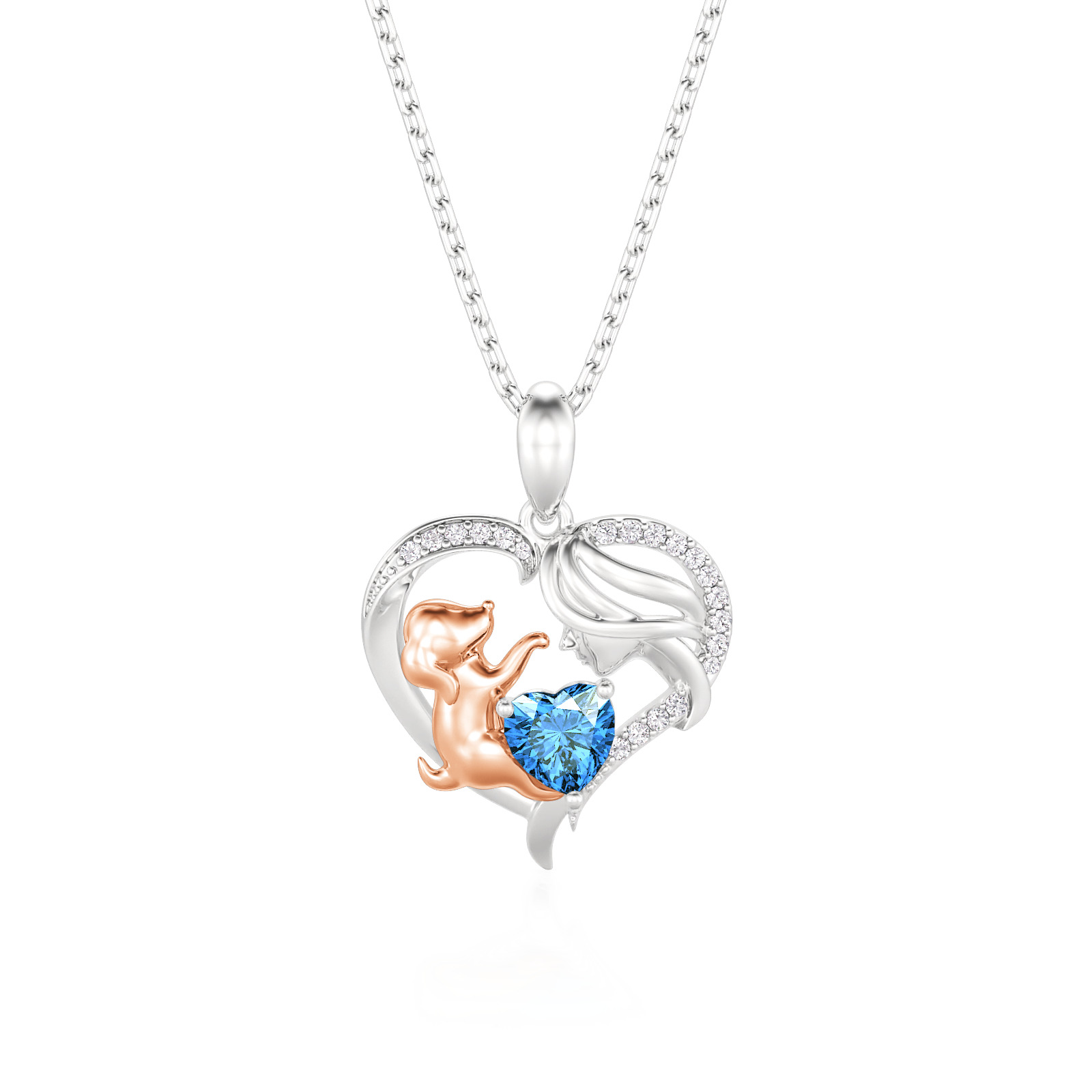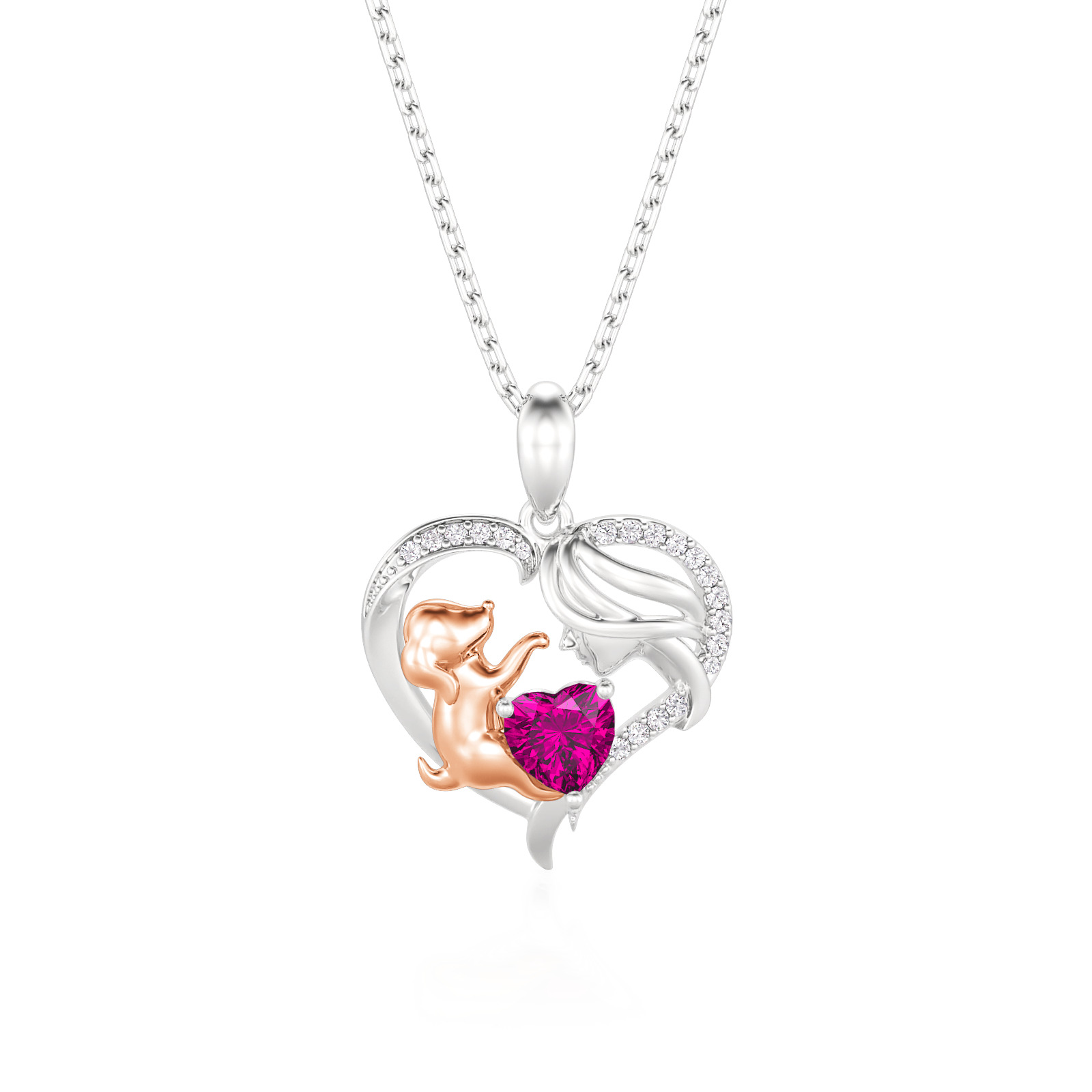 This heartwarming human and dog necklace features a graceful sterling silver heart frame, pavé-set with shimmering accents that enclose a tender scene between a mother and her loyal companion. The rose gold-toned pup reaches toward a vibrant, heart-cut birthstone, symbolizing the joy and unconditional love a pet brings to your life. Expertly crafted with fine attention to detail, this birthstone necklace offers a beautiful way to personalize your story or gift a fellow animal lover. Whether worn as a daily reminder of your furry friend or a sentimental statement piece, this two tone heart necklace radiates a timeless warmth and playful elegance that speaks to the heart.