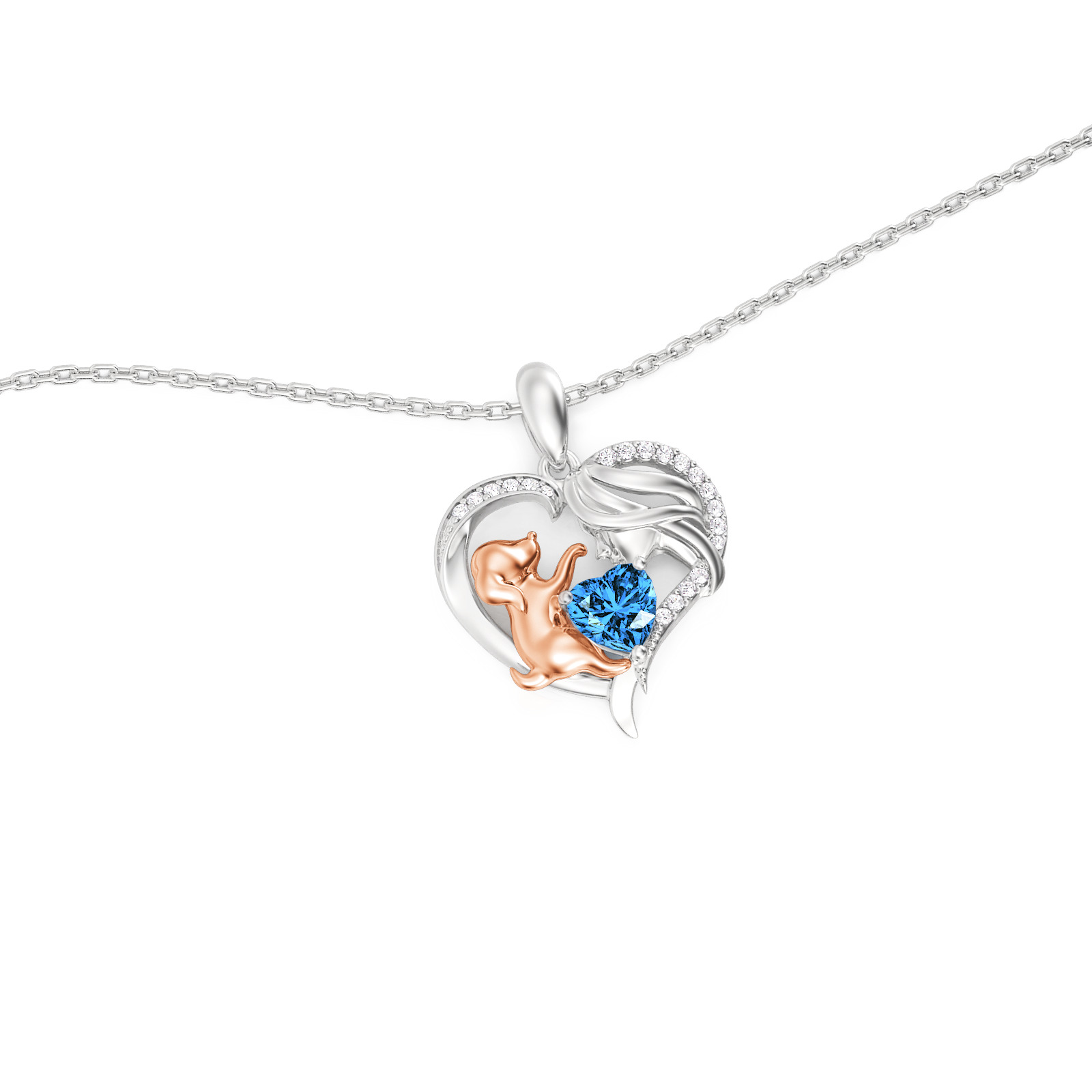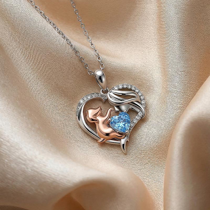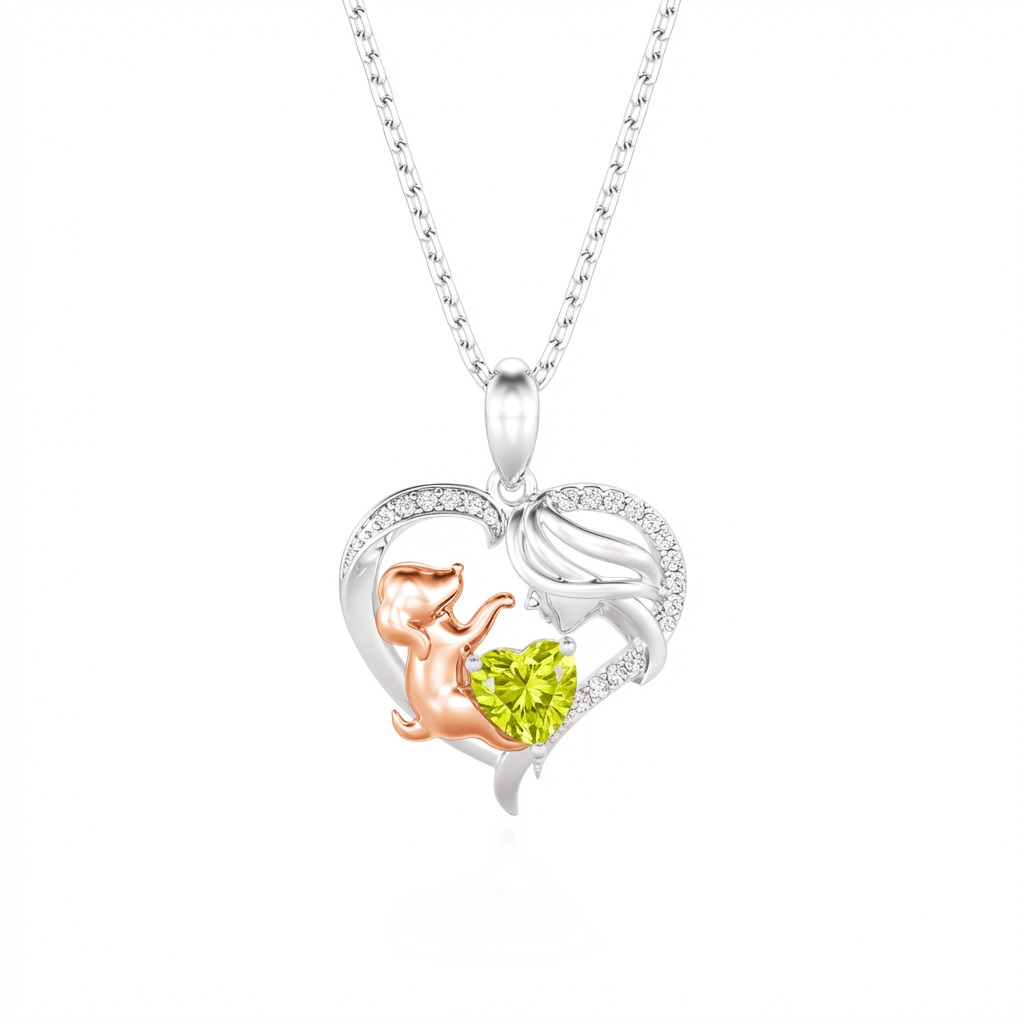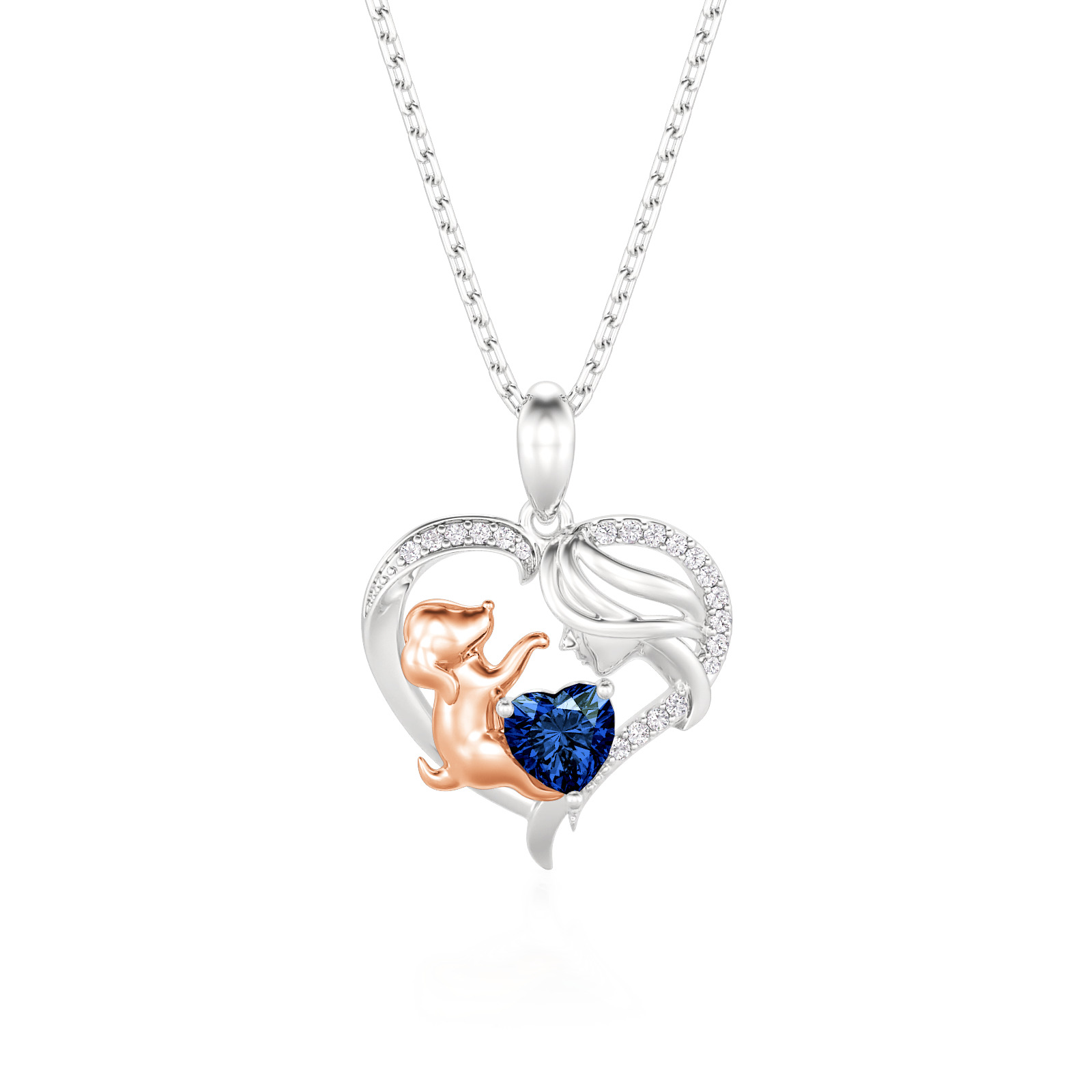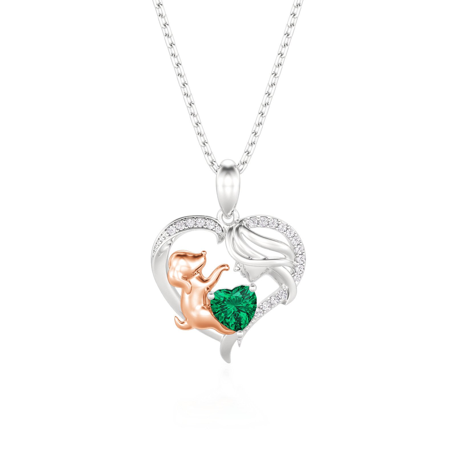 This heartwarming human and dog necklace features a graceful sterling silver heart frame, pavé-set with shimmering accents that enclose a tender scene between a mother and her loyal companion. The rose gold-toned pup reaches toward a vibrant, heart-cut birthstone, symbolizing the joy and unconditional love a pet brings to your life. Expertly crafted with fine attention to detail, this birthstone necklace offers a beautiful way to personalize your story or gift a fellow animal lover. Whether worn as a daily reminder of your furry friend or a sentimental statement piece, this two tone heart necklace radiates a timeless warmth and playful elegance that speaks to the heart.