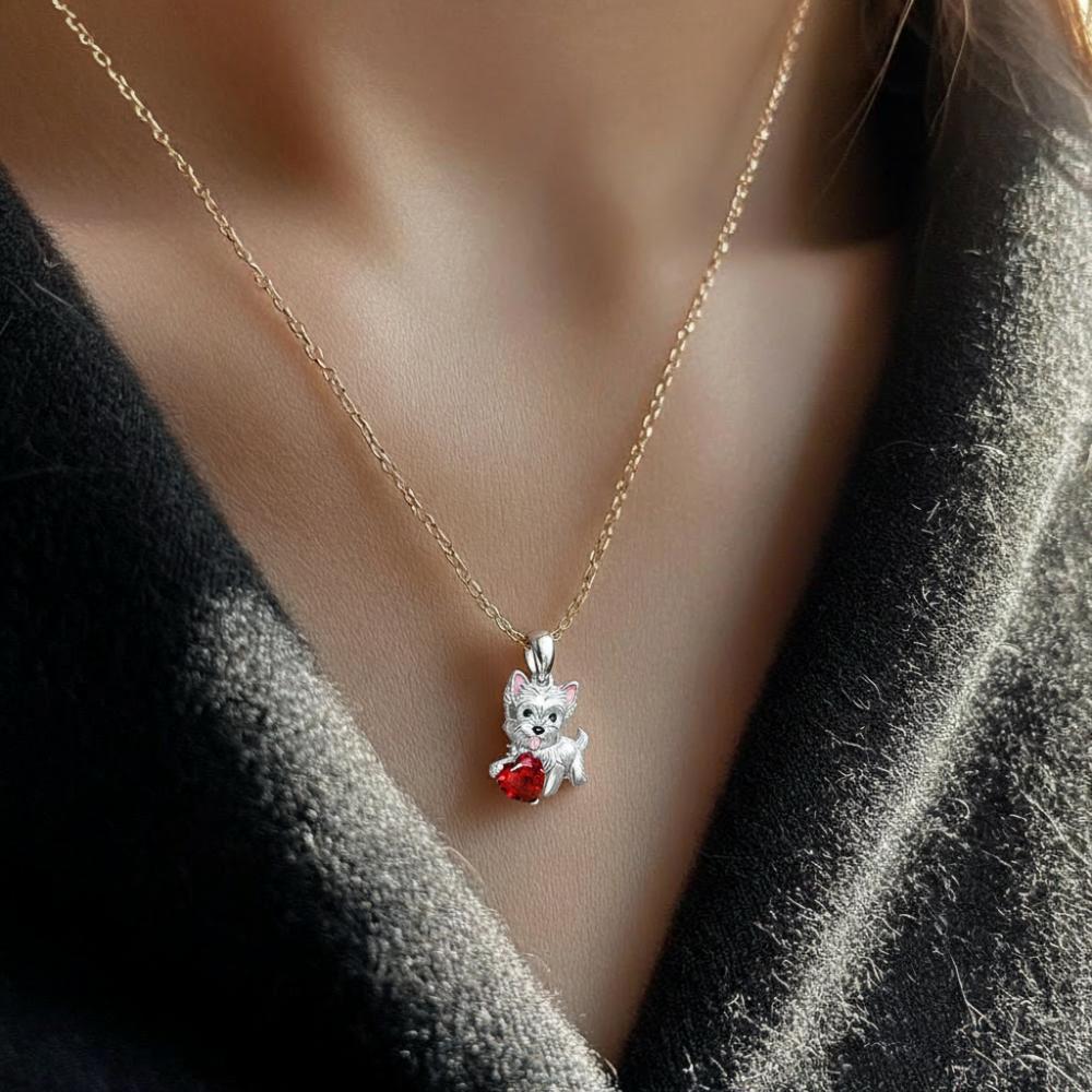 A silver West Highland Terrier charms with softly textured fur and pink-accented ears, gently holding a red heart-shaped birthstone in its mouth. Customize the heart’s color to celebrate your companion’s spirit with the Jeulia Petland West Highland Terrier Puppy Birthstone Necklace: a wearable portrait of loyalty and playful affection.