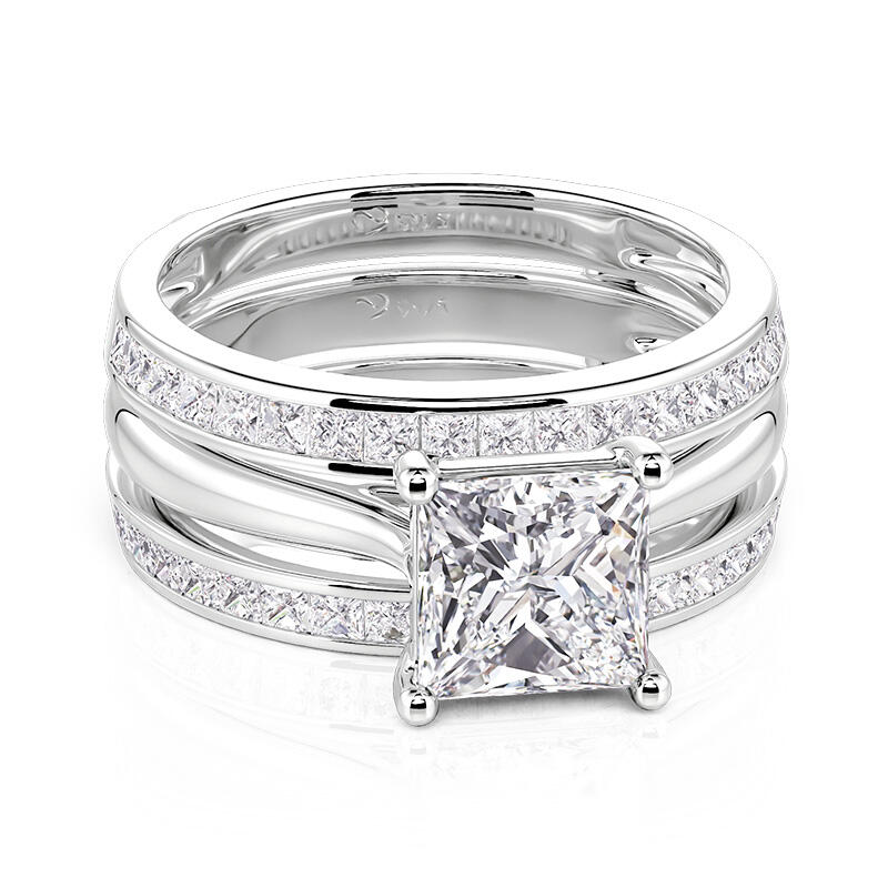 Mark the beginning of your lifetime together with this lovely ring set. This exquisite style features a solitaire princess cut engagement ring, and enhancer are decorated by additional princess cut stones to complete the look. It's a symbol of faithfulness and everlasting love. Express all the love you hold in your heart with this exquisite ring set.