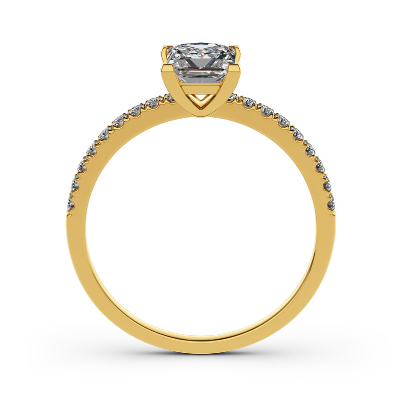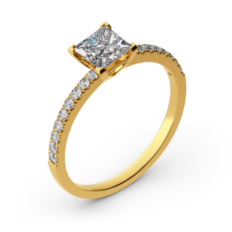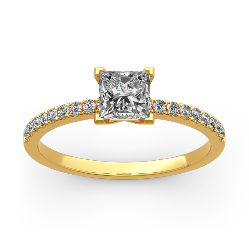 A brilliant beginning to your romantic love story, there is no style more lovely, sophisticated and classic than this engagement ring. It features a brilliant princess cut stone shines at the center of the style, while additional stones sparkle on the ring's shank for extra shimmer. Promise to love her for a lifetime when you present her with this elegant engagement ring.