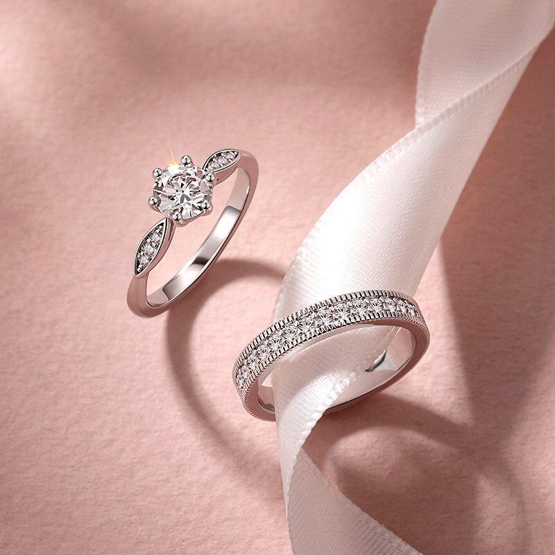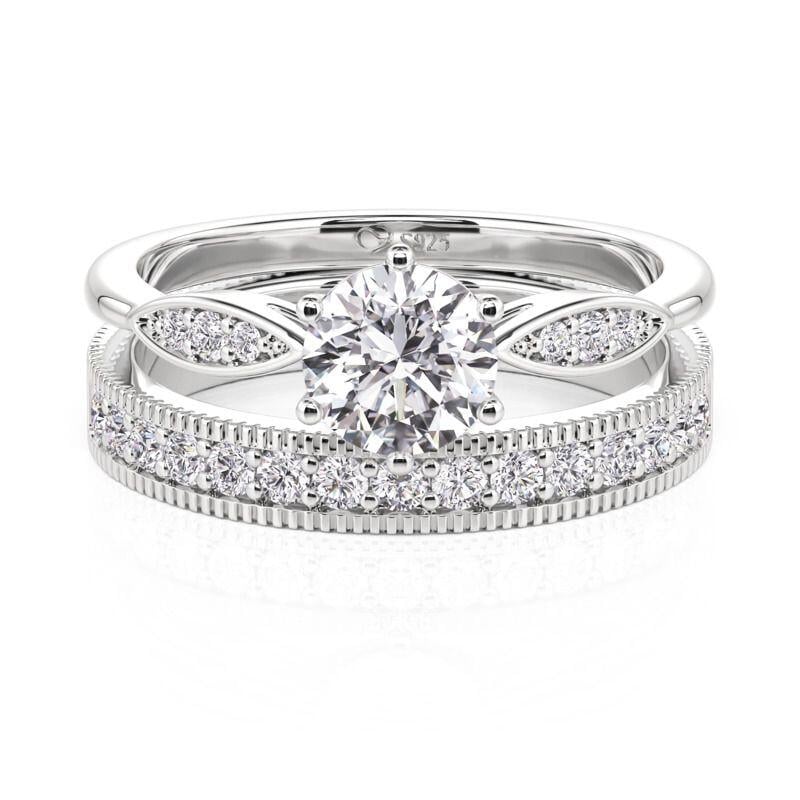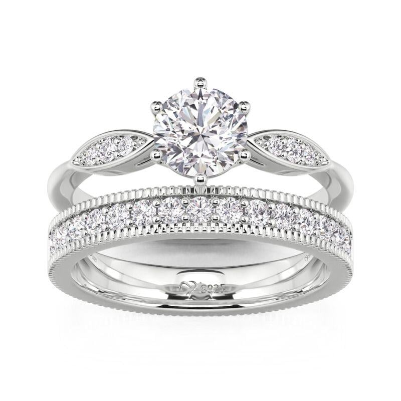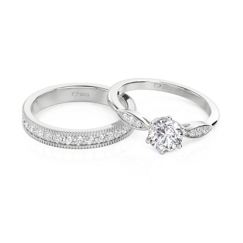 This Jeulia 2-Piece Round Cut Engagement Ring and Wedding Band Set centers on a classic round stone, blending clean architectural lines with intricate knurling to create a unique ensemble that harmonizes modernity with vintage charm. The main ring features a dazzling round center stone securely held by a six-prong setting, with the shank sculpted into a sleek marquise silhouette that elongates the visual lines. The accompanying fluted band features intricately carved, uniform three-dimensional patterns, creating a beautiful textural contrast against the main ring's polished mirror finish. The bridal set can be worn together or separately. When stacked, it offers distinct layers and dazzling brilliance; worn individually, each piece possesses its own distinct style. Whether as a token of commitment for a significant moment or an elegant accent for everyday wear, this silver engagement and wedding ring set carries enduring love.