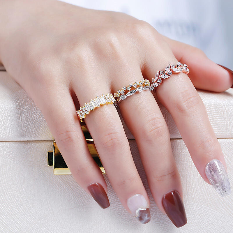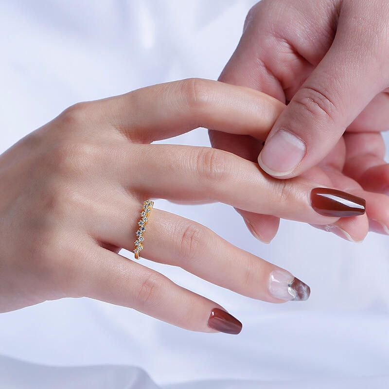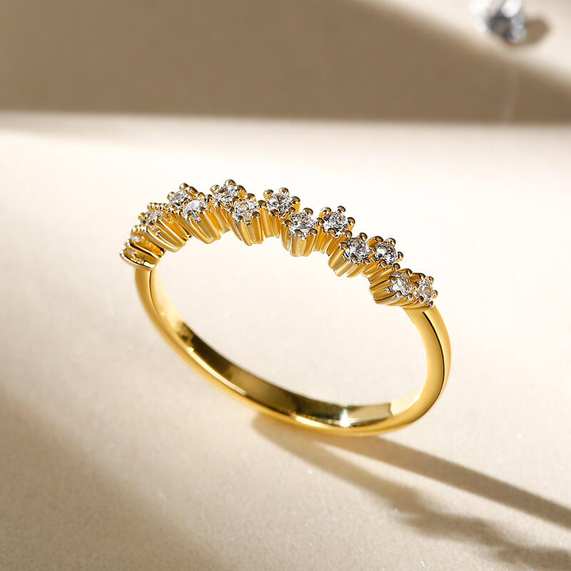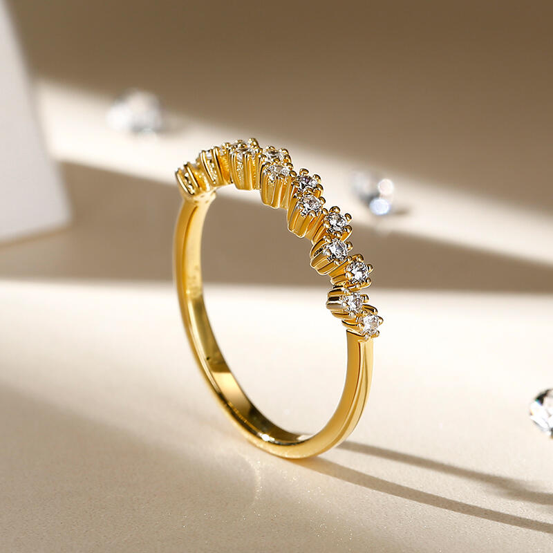 Like your love, this moissanite anniversary band is a classic that never goes out of style. Stunning prong-set stones in a sculptural alternating pattern appear to float above the finger for an effortless, unique look. Its simple style is fit for every lady. You can wear it separately or stack it with other rings. Treat yourself with this piece.