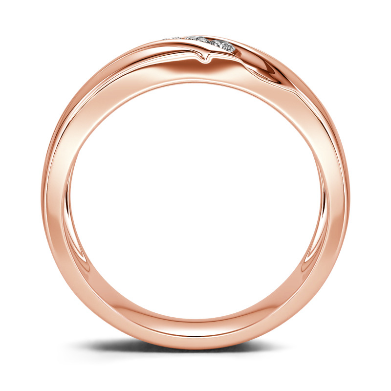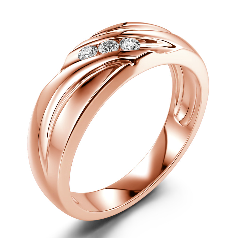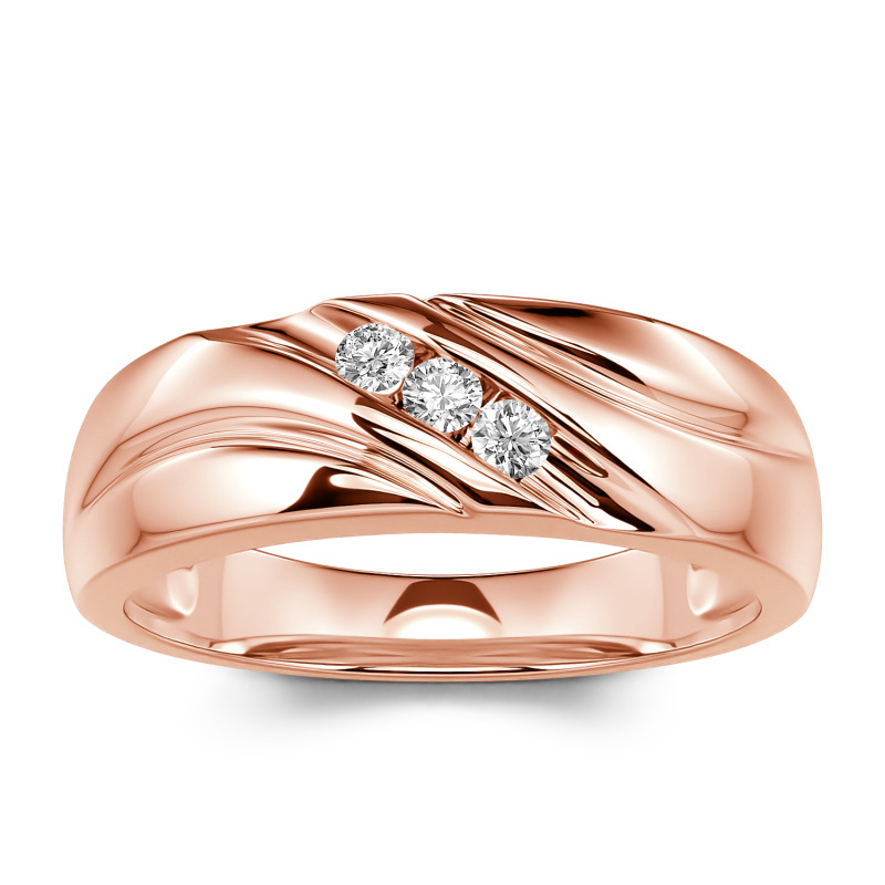 Contoured lines and a trio of moissanite flow along this handsome men's wedding band. This piece is highlighted by a diagonal stripe of three round stones adding a touch of eye-catching style. The perfectly polished finish, together with the striking shine of channel-set stones, is definitely a fashionable choice for him.