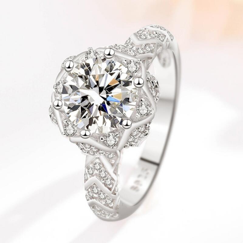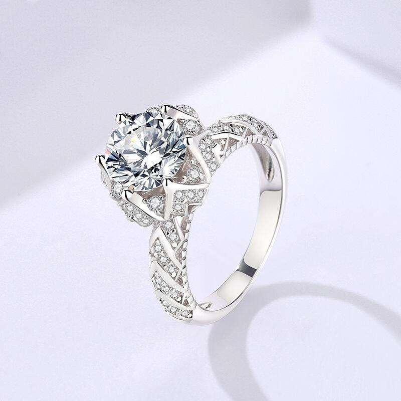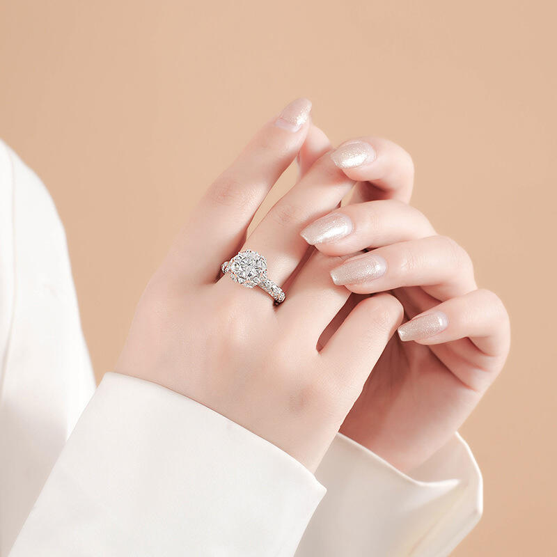 The classic engagement ring is designed with a round cut main stone and flower shape, with small stones of the same size set pave setting around the main stone and on the arm. There are also regular lines on the arms, like the lines on the petals of a flower. From a distance, it looks like a bunch of flowers growing between your fingers.