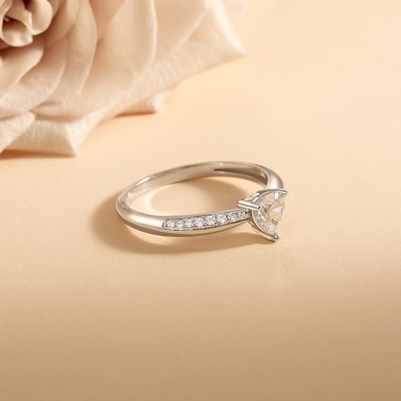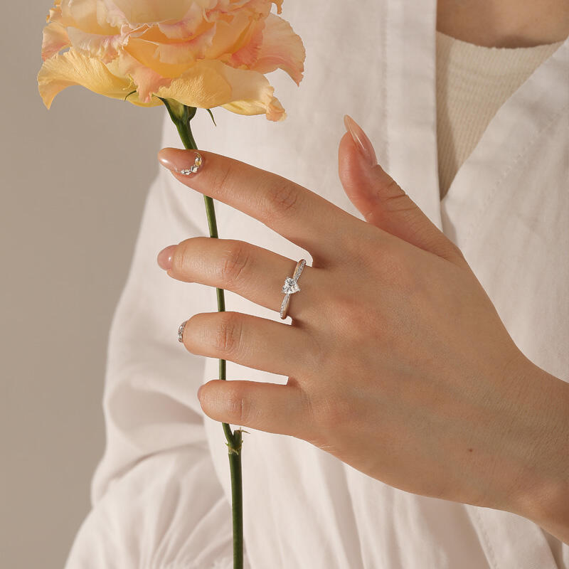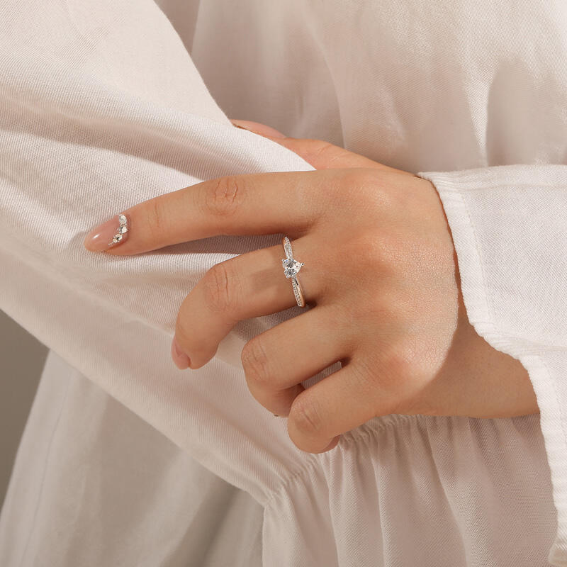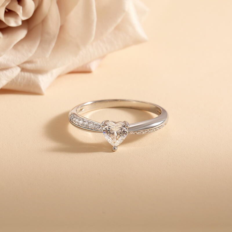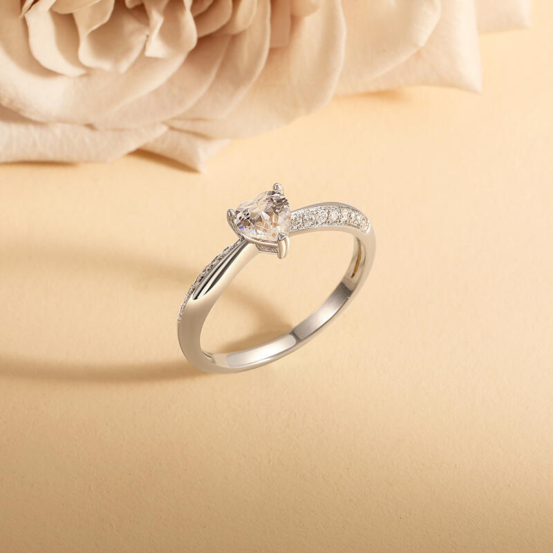 Celebrate your love with our elegantly simple heart-shaped solitaire engagement ring. The stunning heart-cut center stone captures the essence of your affection, while the delicately intertwined rows of smaller stones adorning each side of the band represent the beautiful journey you've embarked on together. Whether exchanging vows or commemorating your love, this heart ring with eternity band serves as a constant reminder of your unique bond, making it the ideal choice for couples seeking a meaningful and stylish expression of their devotion.