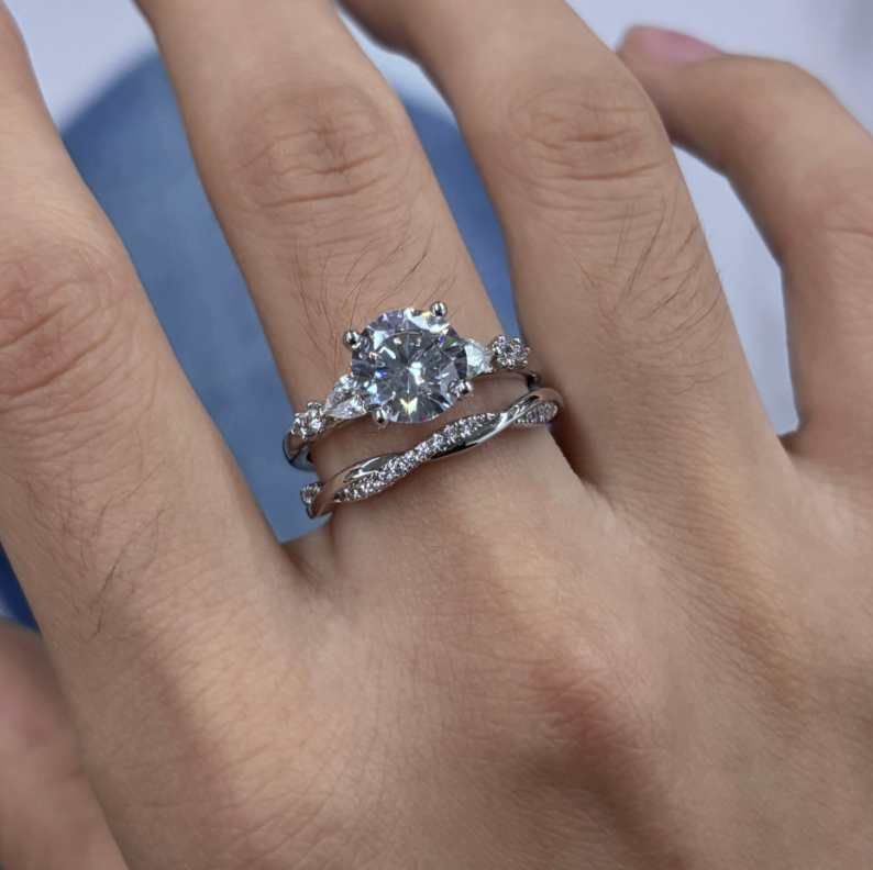 Elevate your love story with the Jeulia simple three stone bridal set. The main ring features a dazzling round - cut center stone flanked by two pear - shaped stones. The secondary ring boasts a twisted band design with pave - set accents. Crafted for timeless elegance, this set is perfect for engagements, blending classic three - stone charm with a modern twisted twist. Ideal for brides seeking a sleek, sparkling symbol of forever.
