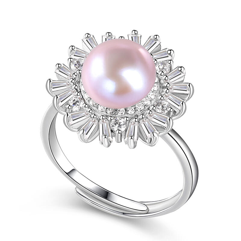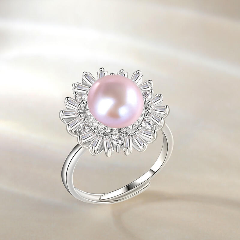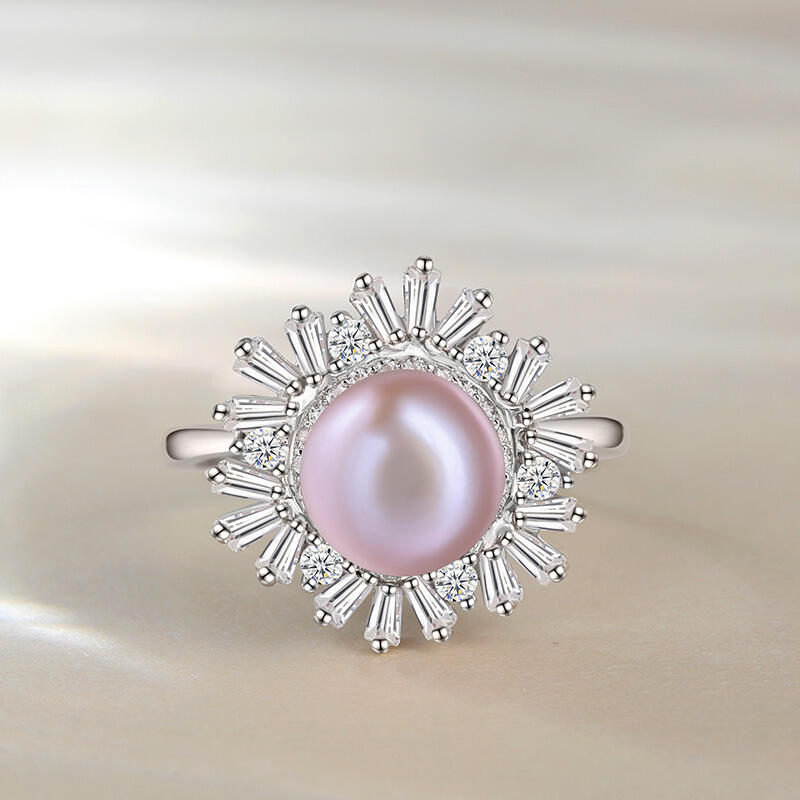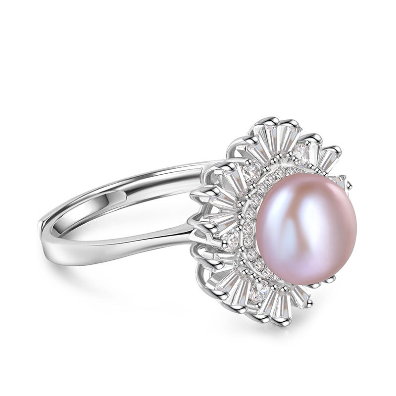 Embrace the enchanting allure of winter with our snowflake-inspired sterling silver ring, featuring a mesmerizing purple freshwater pearl. This piece features a captivating design where the pearl is delicately surrounded by a circle of small stones and tapered baguette stones, forming a stunning snowflake pattern.The snowflake design symbolizes uniqueness and individuality, making this ring a meaningful accessory for those who appreciate distinctive style.