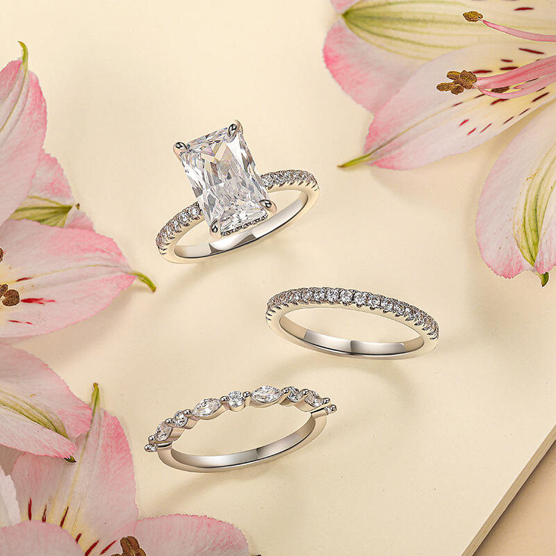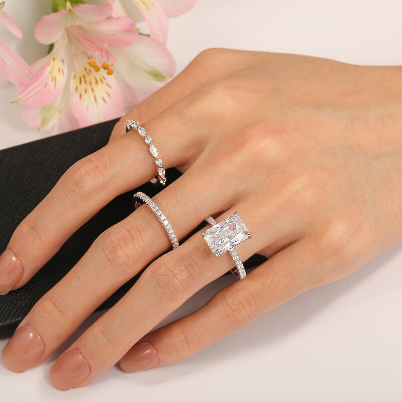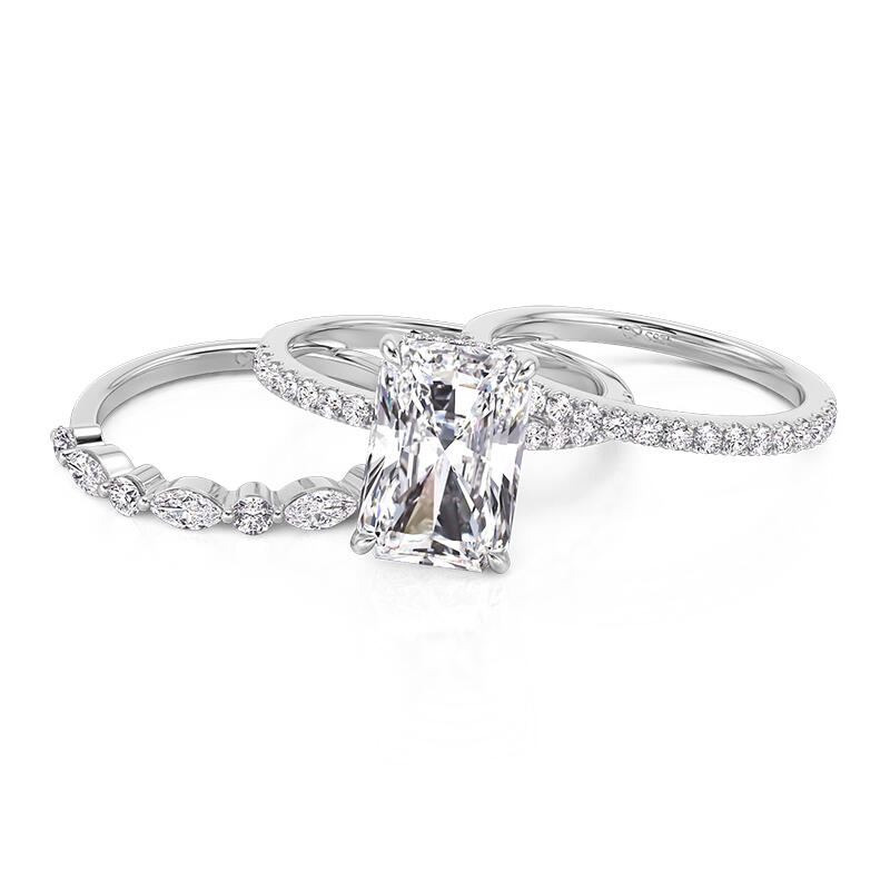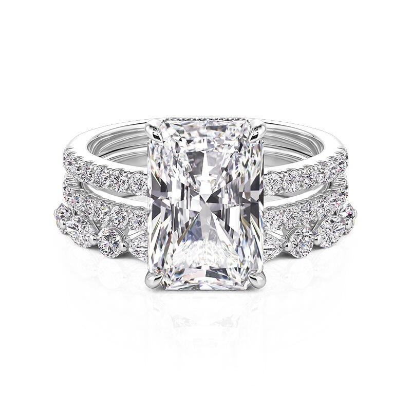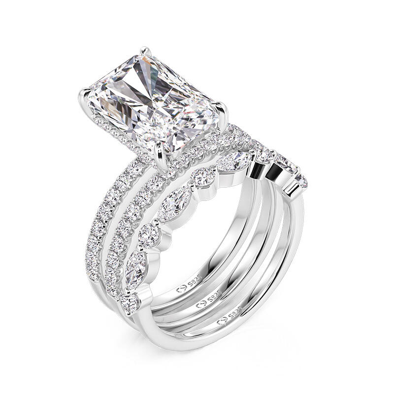 Simplicity meets opulence in this Jeulia Radiant Cut Solitaire Engagement Ring Set, creating a flexible combination for multi-occasion wear. The main ring features a single radiant cut main stone in a four-prong minimalist setting that maximizes its unique stepped fire, and the arms are pave-set to highlight the main stone as the absolute focal point. The matching secondary bands, one also pave-set, are composed of round stones arranged in an arrangement that resembles a river of stars, while the other alternates between horse-eye and round diamonds to create a geometric rhythm. The three rings can be mixed and matched - the main ring on its own for a modern interpretation of the less is more aesthetic; with the pave band for a classic and timeless look; and with the interlocking bands for an avant-garde and artistic touch.