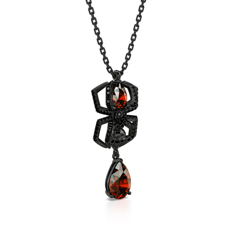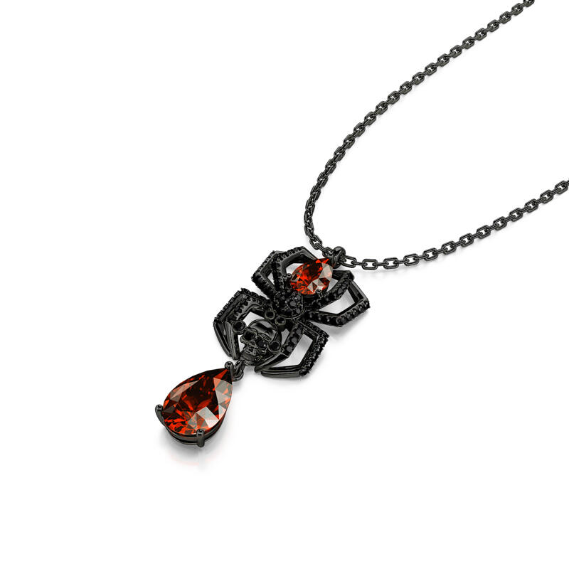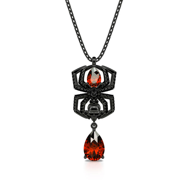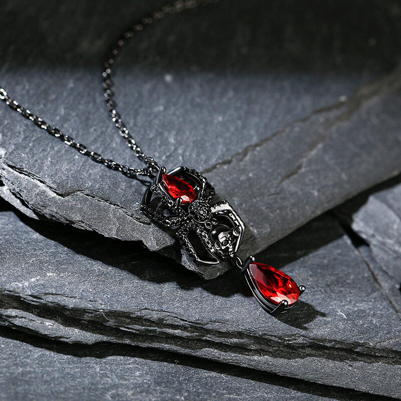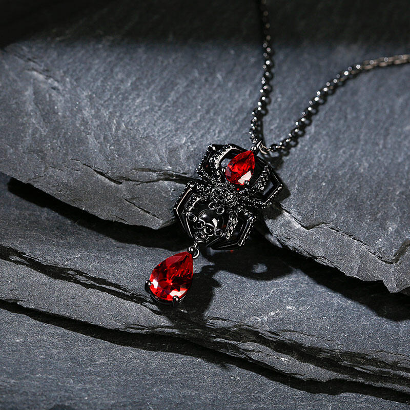 This spider necklace is handcrafted in precious 925 sterling silver with black color plated. A delicate spider is holding a skull head, with one red stone forming the spider’s body and another luxurious one dangling below. Whether you are a lover for spiders, or you are just looking for something striking and creepy to wear to a halloween party, this spider necklace may just do the trick.