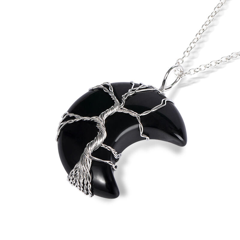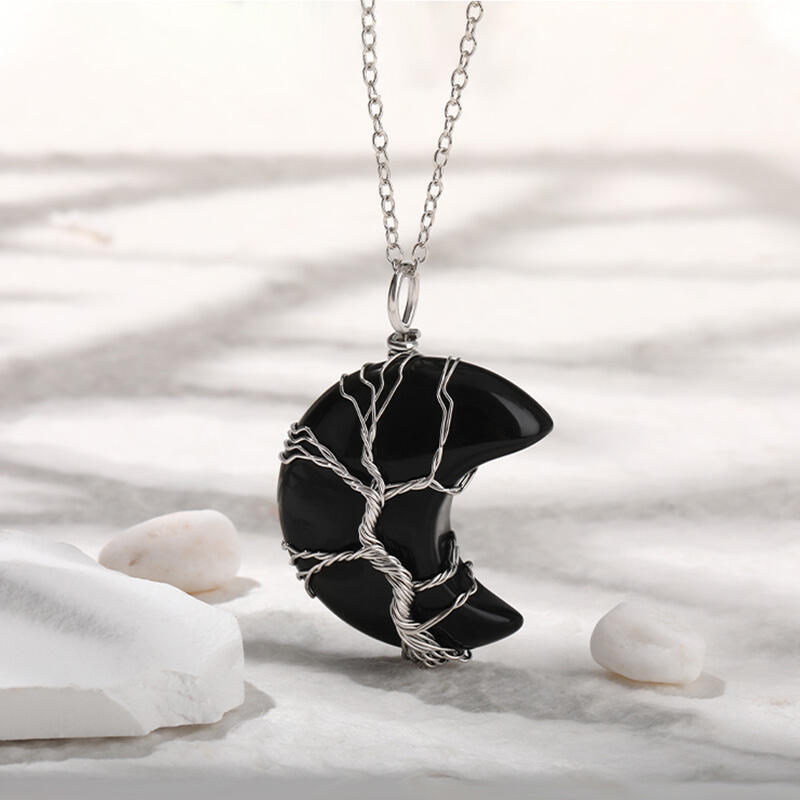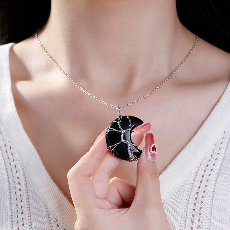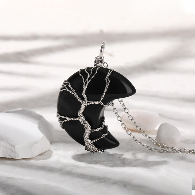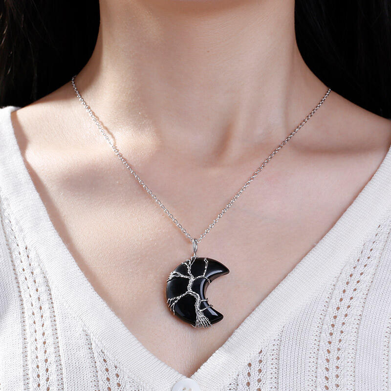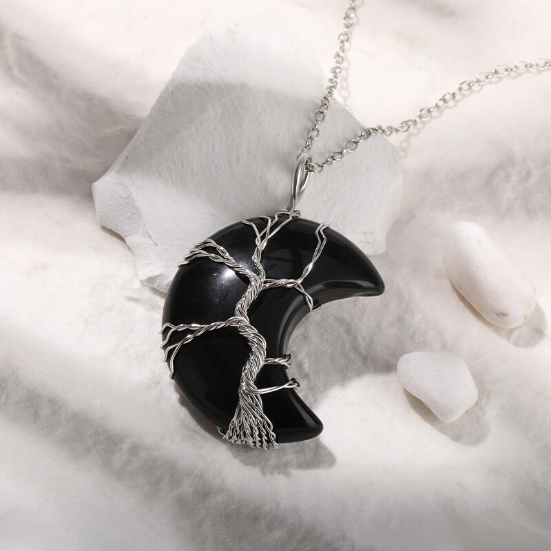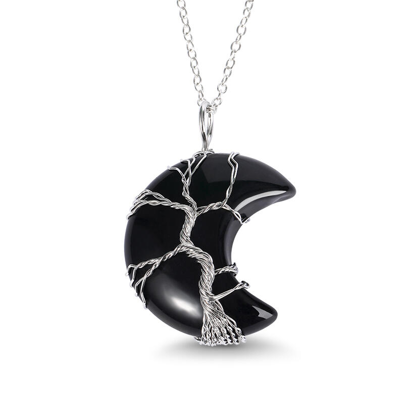 The crescent moon represents receptiveness and reflection, power and change. Combined, the tree of life and the moon form a potent symbol of connection and personal development. This necklace features the tree of life, made from copper, winding around a precious gemstone carved and polished into the shape of a crescent moon. Beauty in the gems, black agate is excellent at healing. It offers powerful vibrations, protection, strength, and focus and gives a significant push in life, making you aware of the surroundings. Its serene energies ground the person further, making them wise in their decisions. Wearing jewelry such as a black agate necklace gives you a jolt of energy to get you all started to go after your dreams.