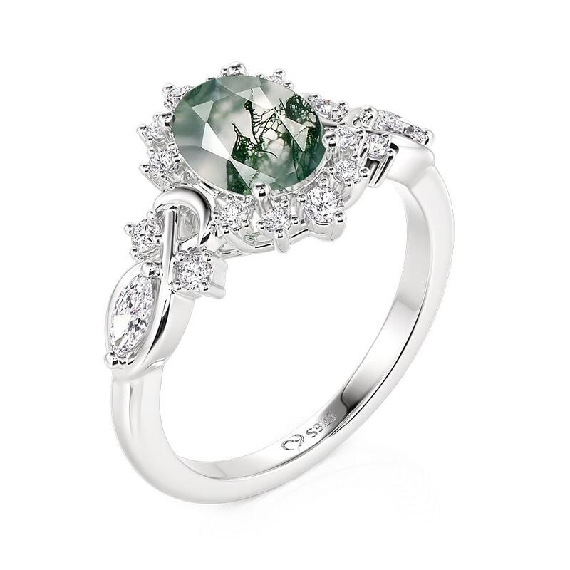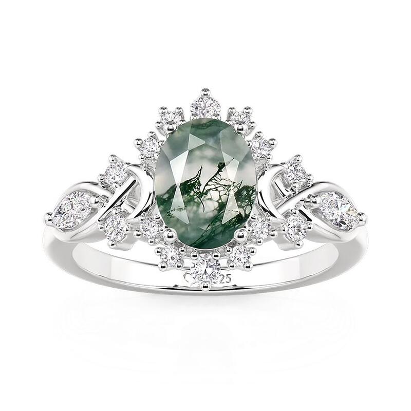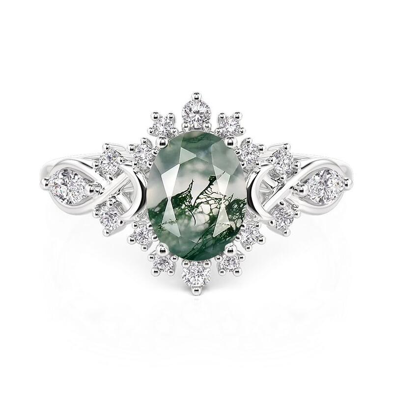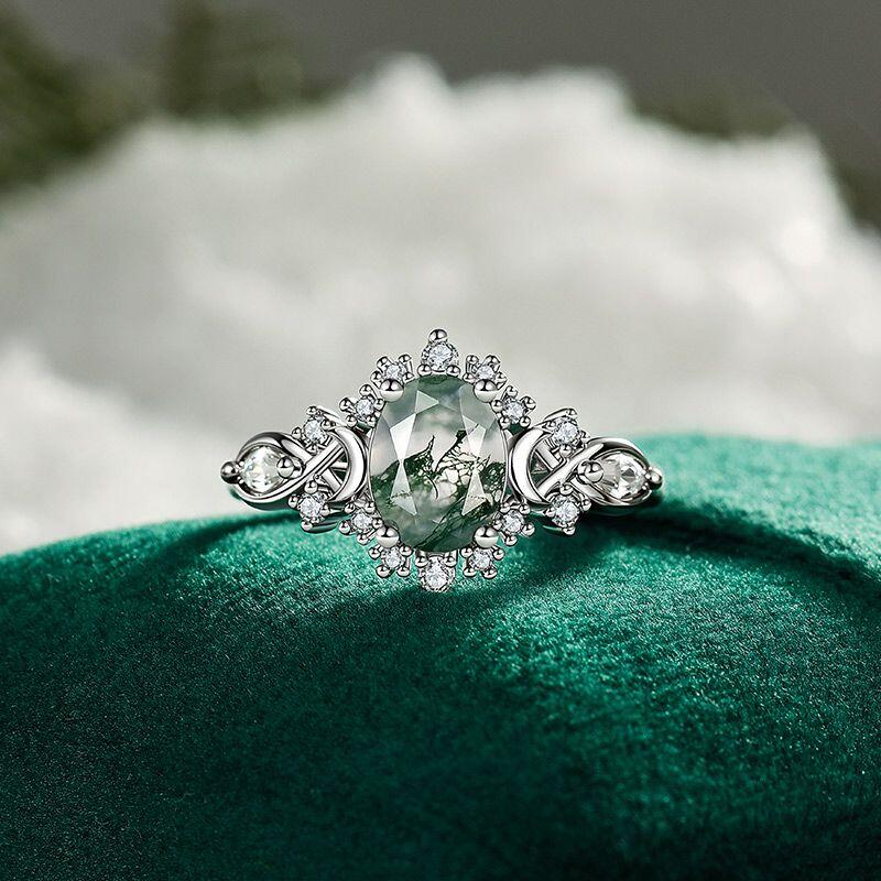 An oval moss agate reveals misty green landscapes within, set among stars and moons crafted in silver and dotted with tiny stones. This Jeulia Oval Moss Agate Engagement Ring carries the calm of forests and the magic of night skies—for the bride who dreams in earth tones and starlight.