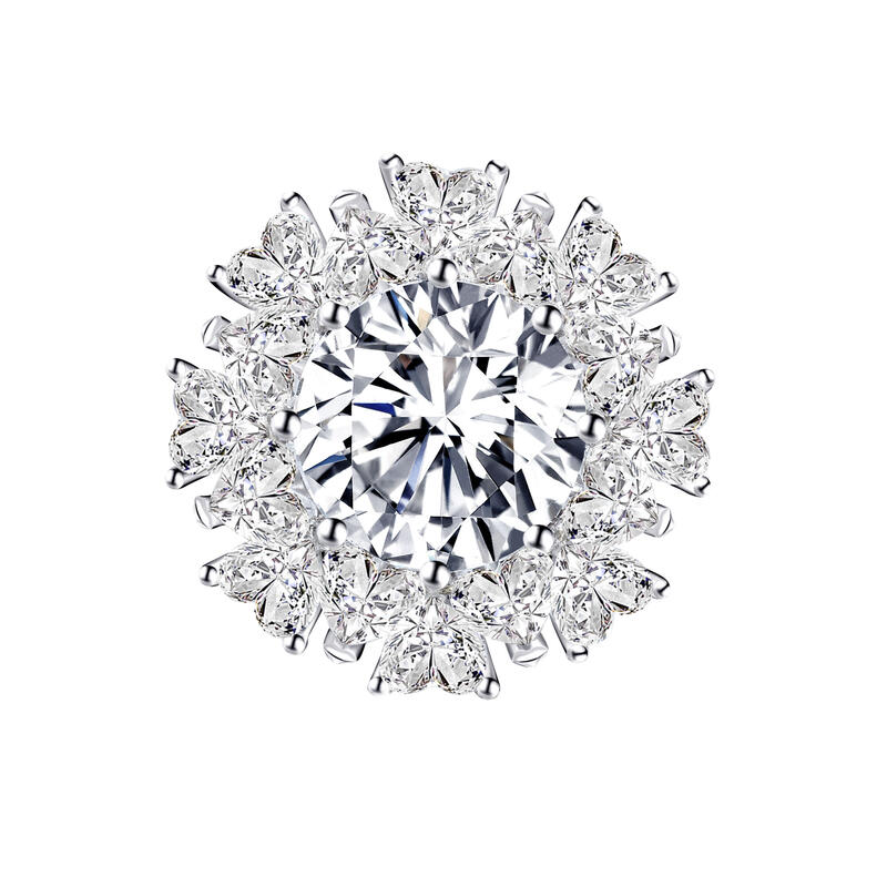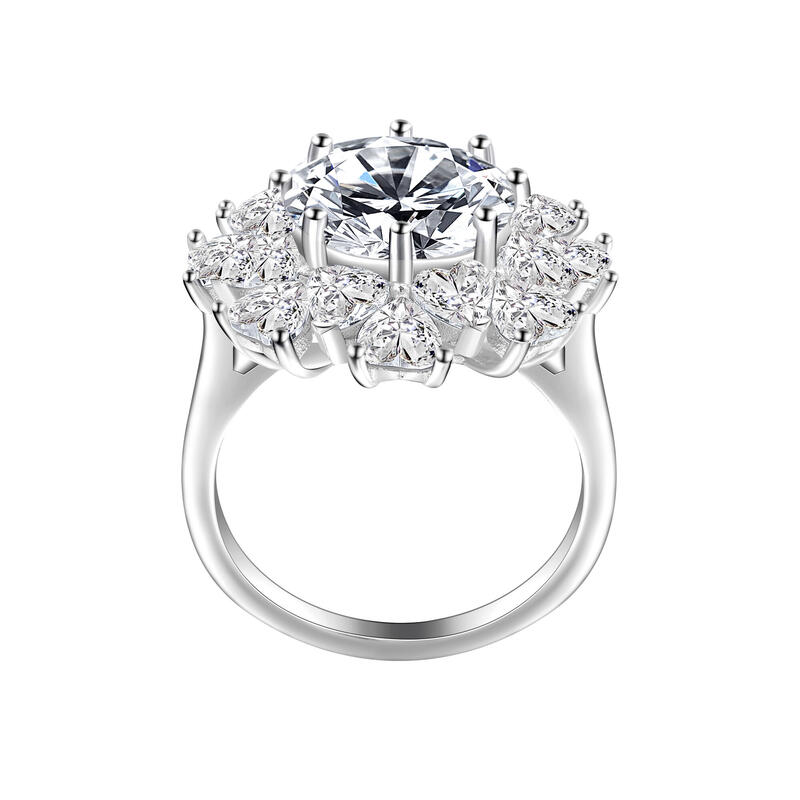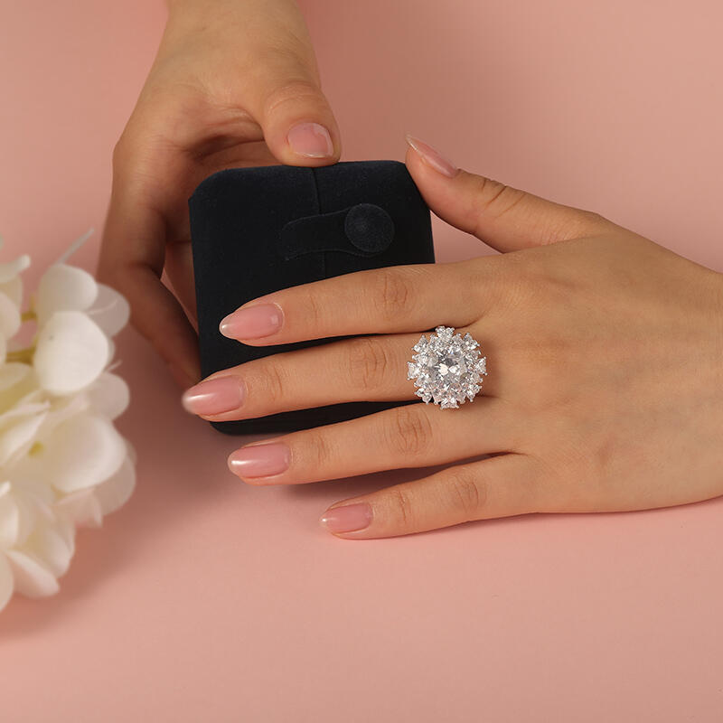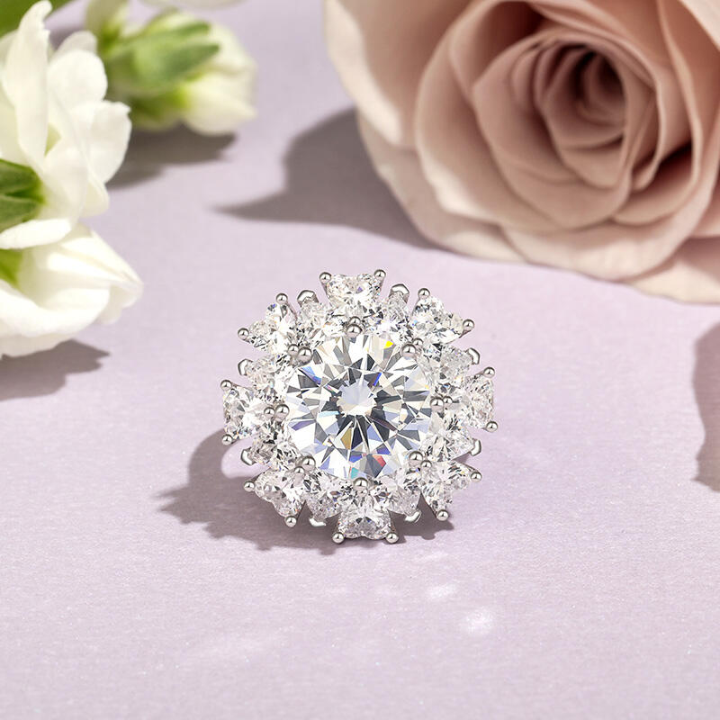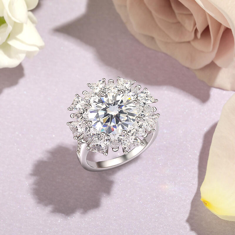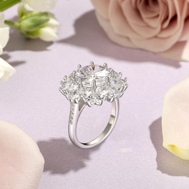 This sunflower halo engagement ring allows the light of love to bloom gracefully on your fingertips. The center is inlaid with a dazzling 5-carat main stone, like the heart of the scorching sun, shining. The exquisite design of the shape of the sunflower symbolizes the warmth and hope of love, and each petal carries the yearning and promise of a better life.