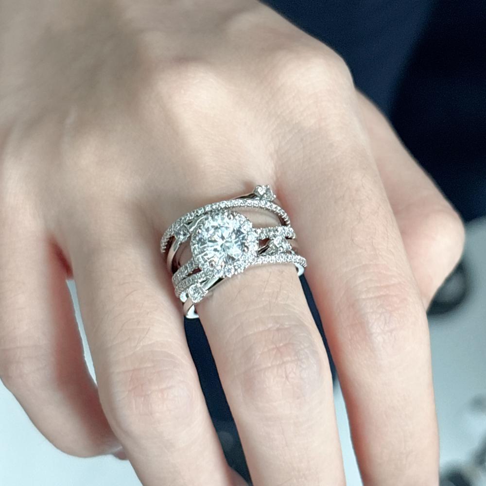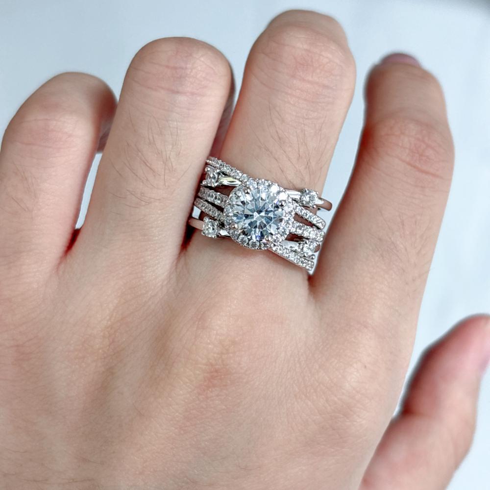 Celebrate your love with the Jeulia symmetrical twisted enhancer halo round cut bridal set. This exquisite 3-piece bridal ring set features a stunning round-cut center stone radiating timeless brilliance. It includes a main engagement ring and two symmetrical twisted enhancer bands, whose modern twisted design elegantly complements the classic center stone. When worn together, they create a dazzling layered look, symbolizing the depth and complexity of your bond. Expertly crafted with meticulous attention to detail, each piece is made to last, keeping your symbol of love forever radiant. Ideal for vow exchanges or milestone celebrations, this unique bridal ring set blends classic charm with contemporary style for the discerning bride.