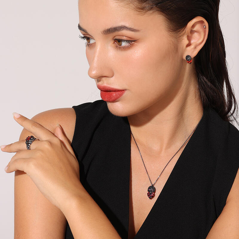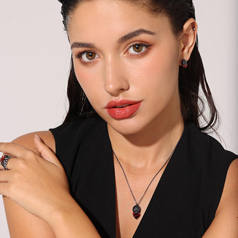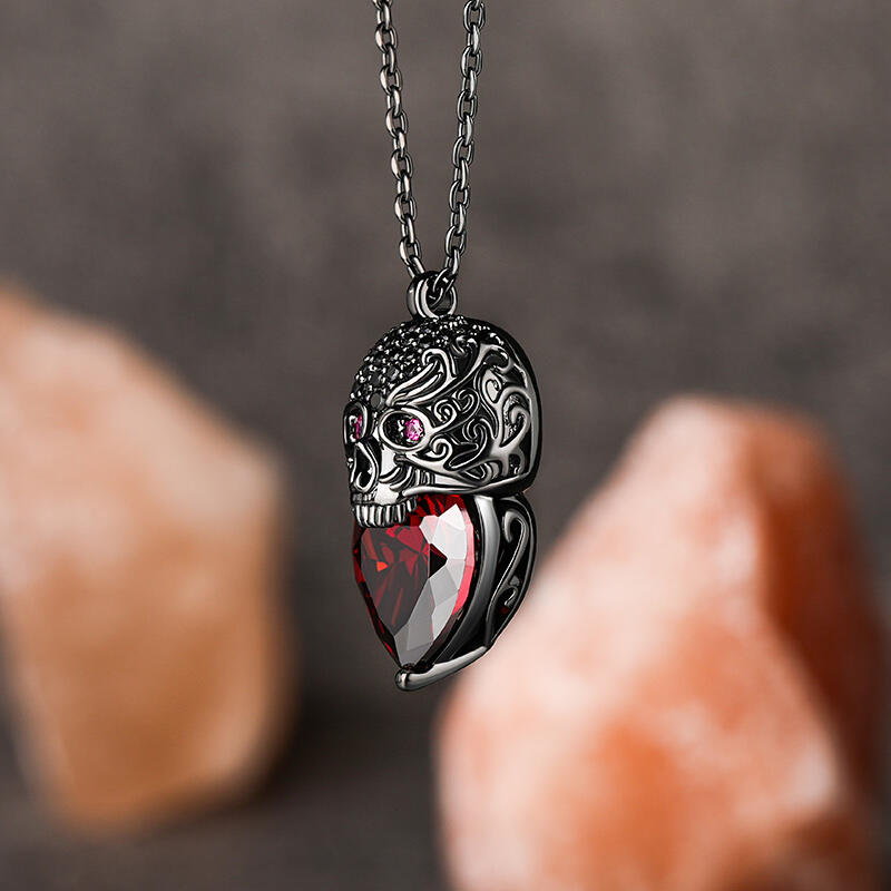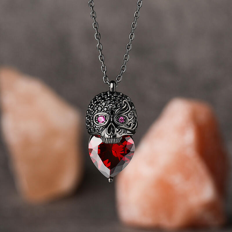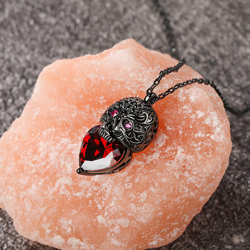 Stunning and sparkling, this skull necklace will capture your heart at first sight. The skull is one of the most attractive and fashionable motifs. Ocean waves are one of the most awe-inspiring natural forces. Combining energy, power, ferocity and beauty, they have captivated artists for centuries. Inspired by skull and ocean waves, this sterling silver necklace features an exquisitely handcrafted waves skull paved with shining stones with a huge red heart-cut stone. Treat yourself or surprise her with this masterpiece this holiday.