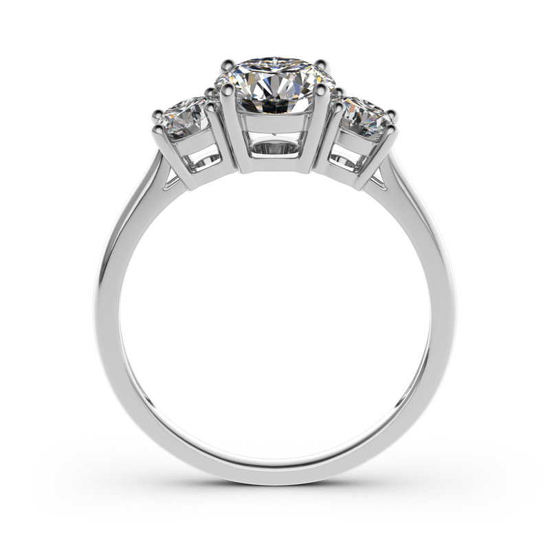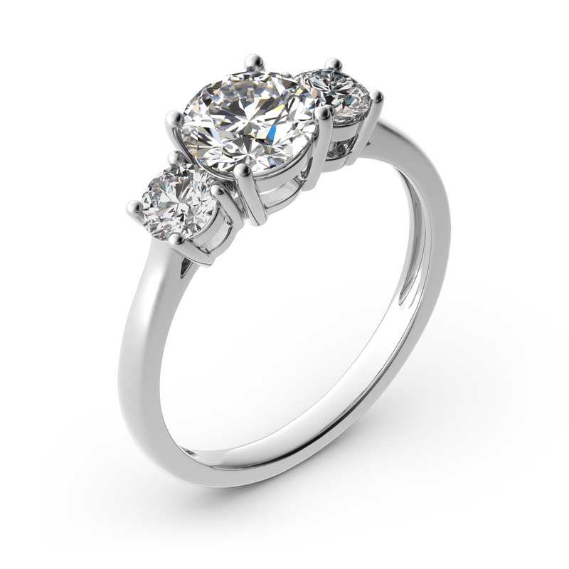 Speak words of love and devotion as your present her with this gleaming three-stone engagement ring.Glittering in bold brilliance, this elegant design showcases a sparkling round cut stone at the center, while two smaller round stones flank the center stone for extra shimmer. All stones shine brightly enough to be deserving as a symbol of your love.