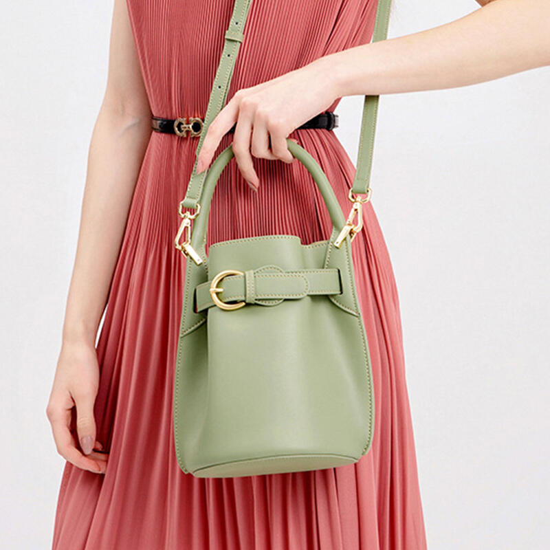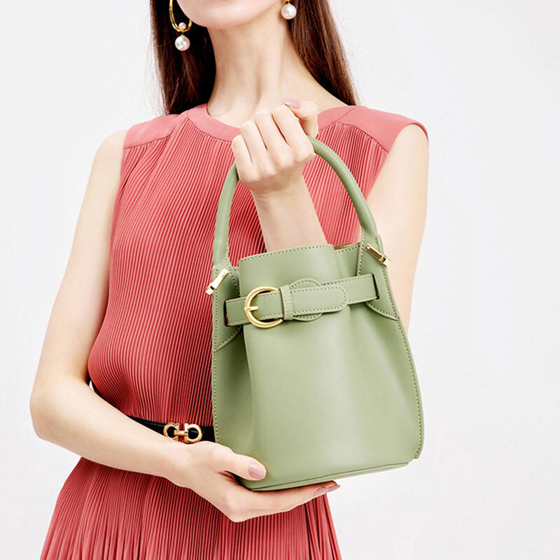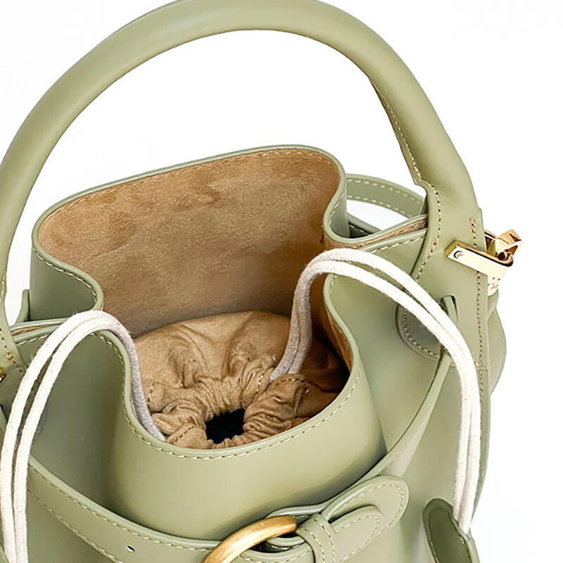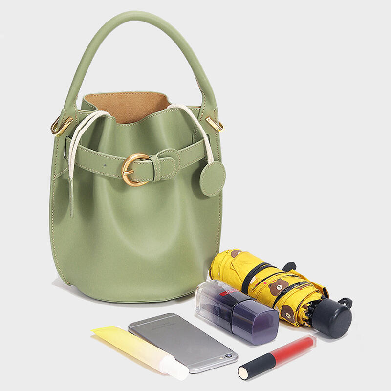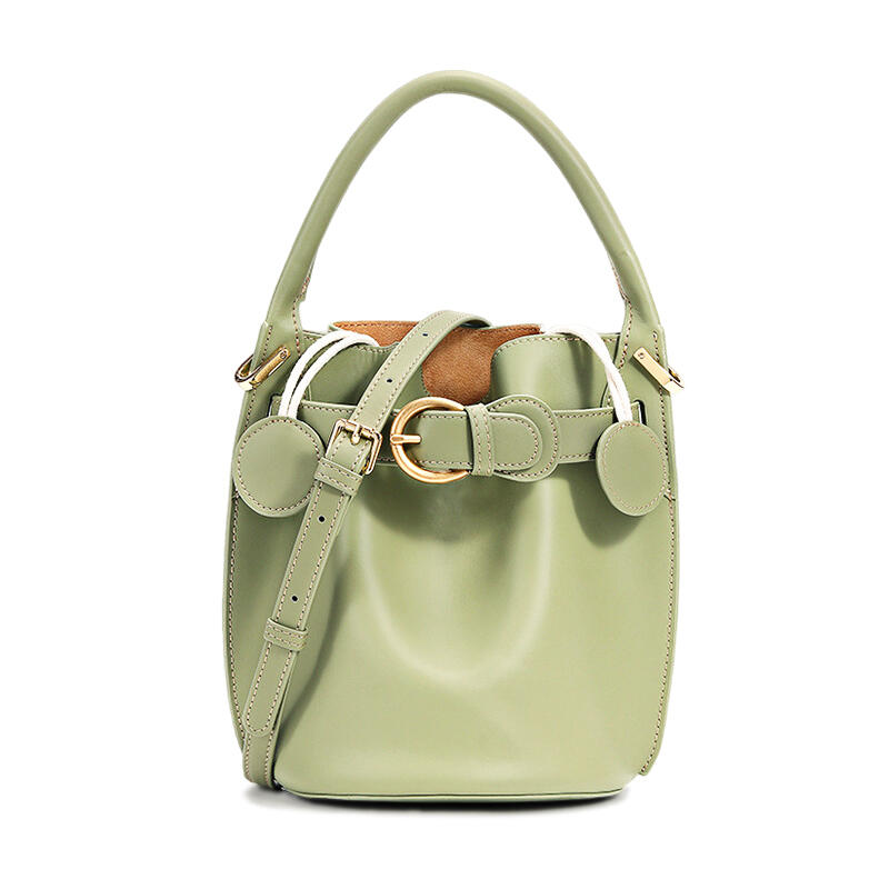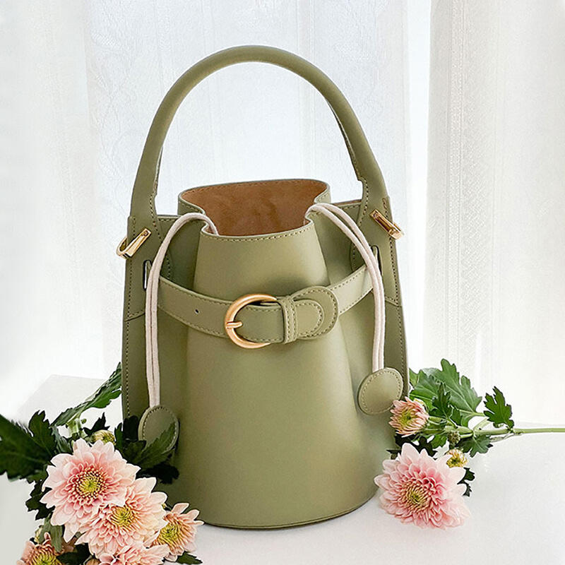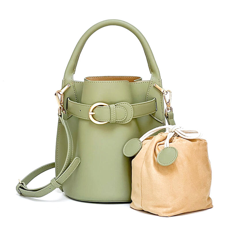 Jeulia Timeless Bucket Bag Green Satin Calfskin Leather Handbag with Belt