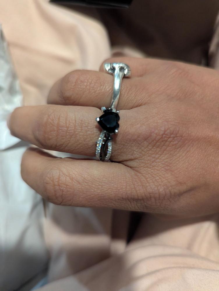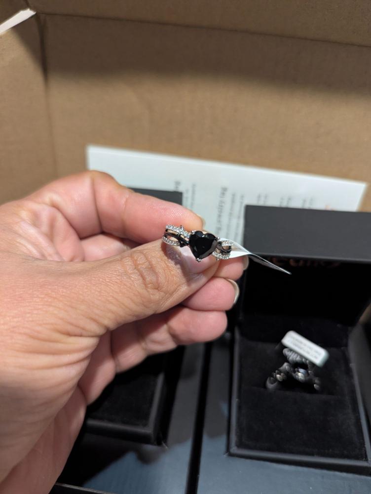 In the dark night sky, a mysterious black heart-shaped gem quietly blooms. Surrounding this heart-shaped gemstone are carefully carved lines of thorns, both elegant and with a hint of wildness. This twist heart promise ring tells a story of resilience and tenderness. The thorns represent the trials and challenges of life, while the black heart-shaped stone symbolizes love that still burns in the face of adversity. When you wear this black heart promise ring, it is as if you can feel the strength welling up inside your heart. No matter what the storm, our love will blossom eternally under the protection of thorns, just like this black heart.