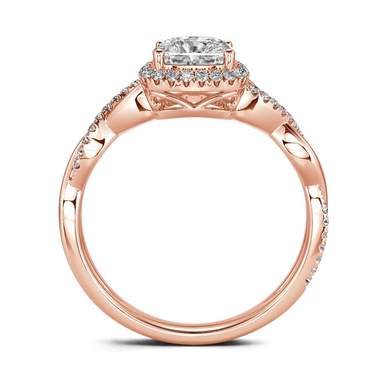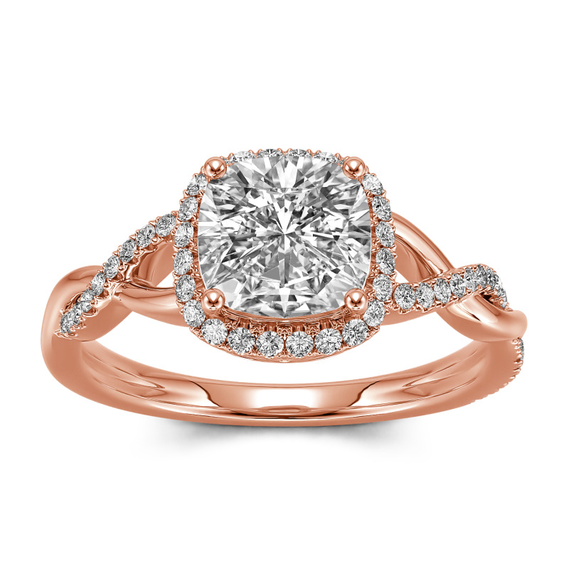 Express your love with the charming twist design of this moissanite engagement ring. This elegant design showcases a sparkling cushion-cut center stone wrapped in a frame of round stones. Along the shank, polished and sparkling stone-lined ribbons shine in a crossover design. Buffed to a brilliant luster, this engagement ring is an elegant choice.