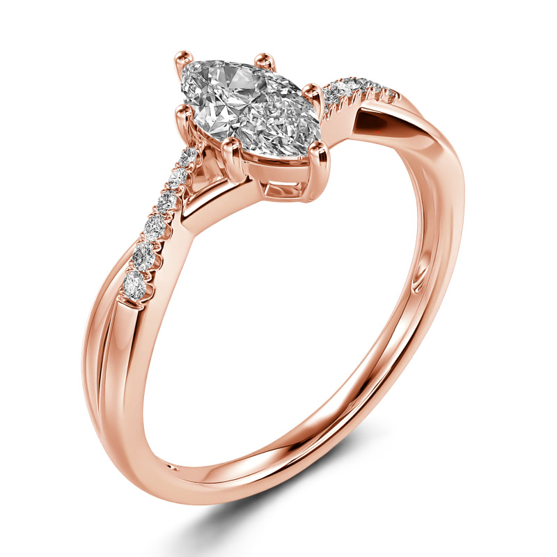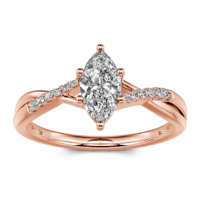 A majestic marquise-cut centrepiece is set in 6 prongs, with gleaming stone-paving shoulders of a subtle twisting design elegantly framing the center moissanite. This beautiful moissanite ring sparks with her delicate skin and adds splendors to her garment. The slim crossing shoulders emit exquisite radiance, complementing the sparkle of the center stone. Dainty and enchanting, this precious ring will meet her special and sophisticated taste.