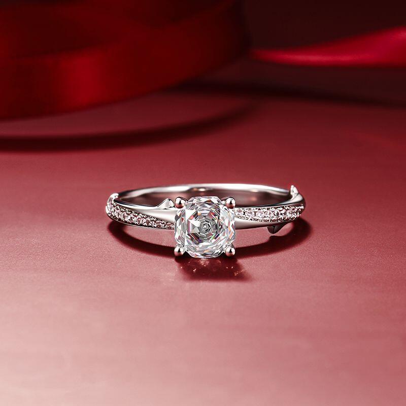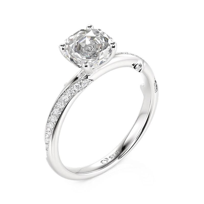 A rose-cut gem glows with vintage softness above wave-like bands paved in delicate stones and etched with subtle floral motifs, merging the grace of flowing water with the quiet shimmer of morning light, making this Jeulia rose cut engagement ring a timelessly romantic and thoughtfully detailed piece.