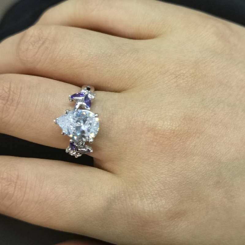 The Jeulia Twisted Pear Shaped Purple Butterfly Ring features a pear-shaped crystal zircon taking flight, flanked by purple wings pavé-set with white zircons. The band twists into delicate antennae curves, their silver strands reflecting light like dew on lavender fields. For unions that transform: two souls alighting as one, forever poised between earth and sky.