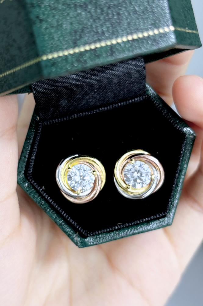 Elevate your style with the Jeulia twisted spiral trinity stud earrings. These fine earrings feature a unique twisted spiral design in three beautiful tones, creating a look that is both modern and elegant. The central round cut stone, with its brilliant cut, sparkles and catches the light from every angle. The three - tone metalwork, combining different shades, adds a touch of sophistication and versatility. Whether you're dressing up for a special occasion or adding a bit of glamour to your everyday outfit, these sterling silver stud earrings are the perfect choice.
