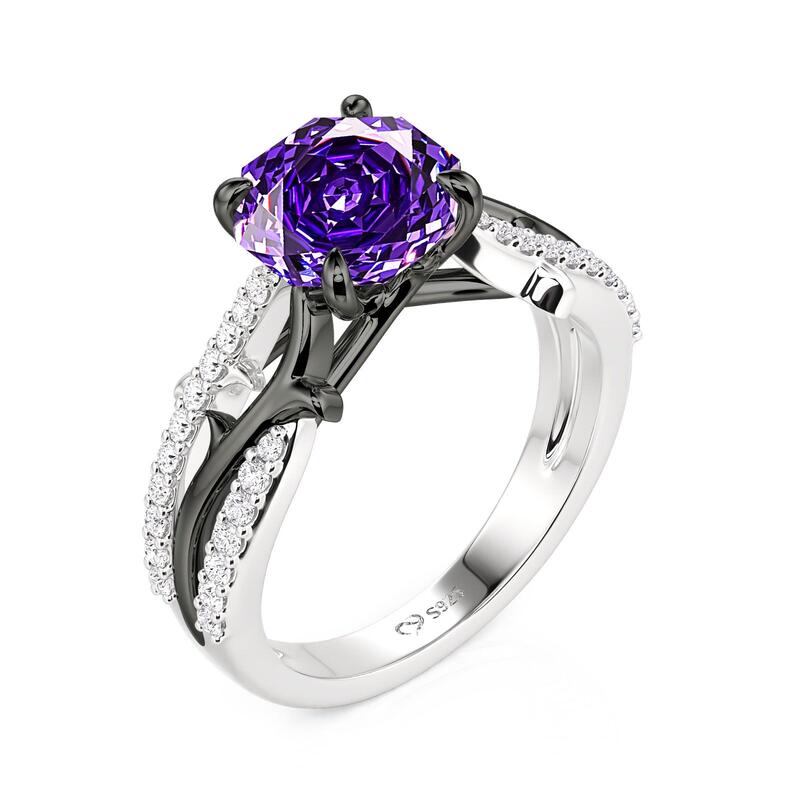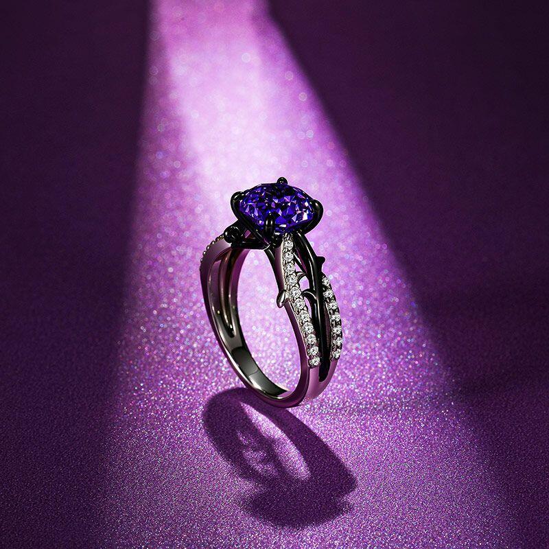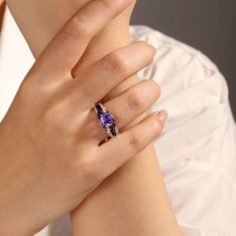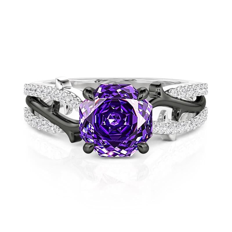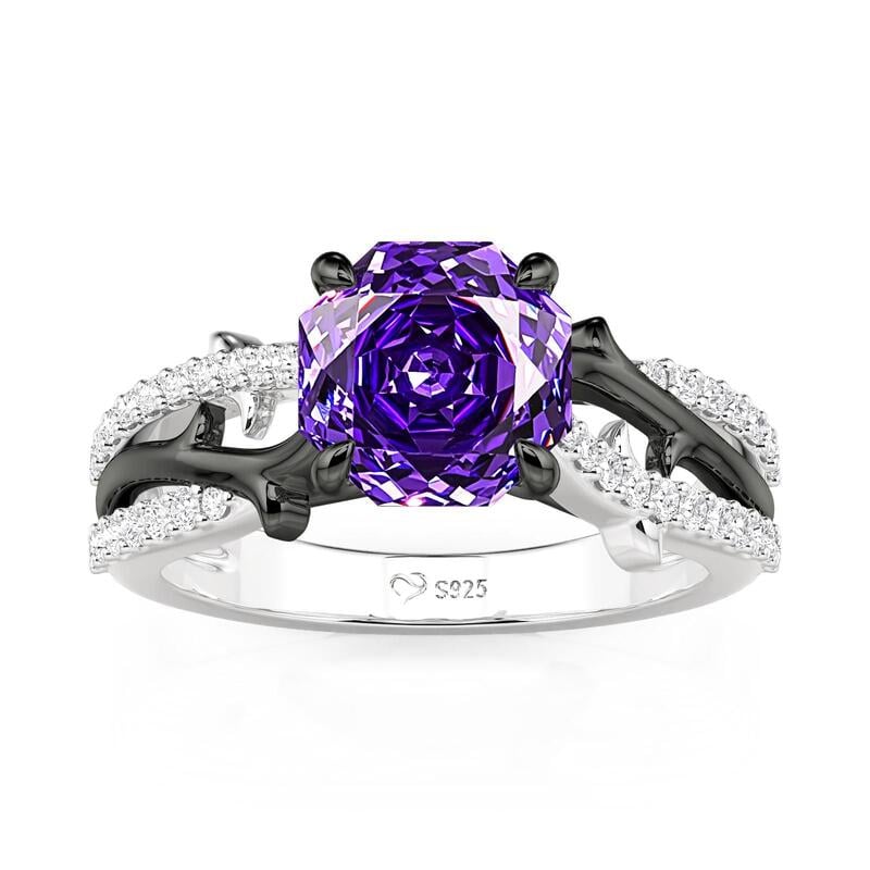 Thorned vines in black and silver wrap around a rose-cut purple gem, where sharp metalwork meets the stone’s soft, luminous glow. This Jeulia Two-Tone Vine Purple Rose Cut Ring is for the romantic nonconformist—beauty and edge, intertwined.