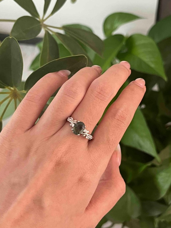 The Jeulia Oval Moss Agate Engagement Ring is a stunning piece that captures the beauty of nature. Featuring an exquisite oval moss agate stone, this nature inspired ring showcases rich green hues that evoke the essence of lush landscapes. The band is elegantly designed with delicate vine leaf accents, symbolizing growth and connection. Crafted from high-quality materials, this moss agate ring is both durable and beautiful, making it a perfect choice for an engagement or a meaningful gift. Whether worn as a symbol of love or simply as a statement piece, the Oval Moss Agate Engagement Ring is a unique and enchanting addition to any jewelry collection, embodying both elegance and a deep connection to nature.