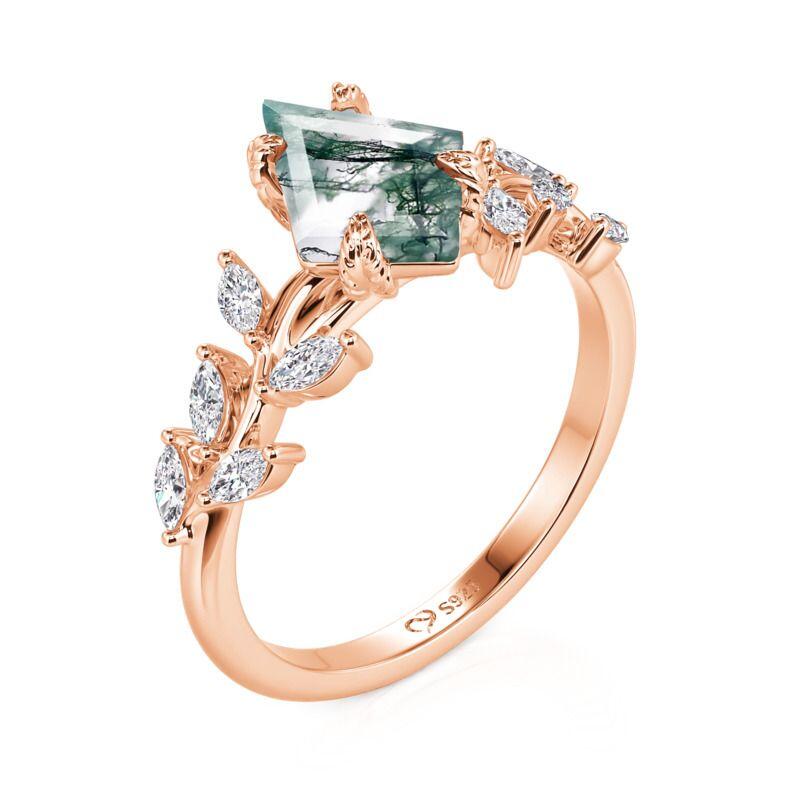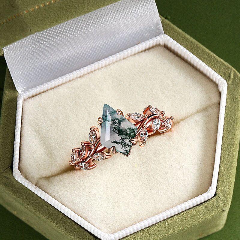 This Jeulia Vine Twist Kite Cut Moss Agate Engagement Ring masterfully captures the vitality of plants and the growth of love. The kite-shaped moss agate center stone floats atop a vine-twisted band. Its unique rhombus cut and natural moss-like patterns within reveal a dappled beauty under light, reminiscent of sunlight filtering through forest foliage. The ring shank features a double-helix vine design, with each branch meticulously micro-engraved to capture authentic wood grain texture. This leaf ring is perfect for exchanging vows at a forest wedding.