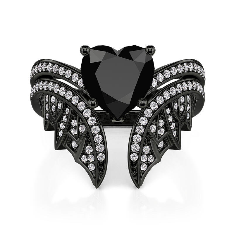 This Jeulia Vintage Bat Heart Wedding Ring Set reinterprets vows of love through Gothic aesthetics. The center ring features a heart-shaped cut stone, its full silhouette encircled by intricately carved bat wings that unfold into a protective embrace. The companion ring continues the bat motif, with abstract wings extending from both sides of the band. Pavé stones taper gracefully from the knuckle toward the fingertip. The bridal set allows for separate styling: the main ring exudes dark elegance when worn alone, while stacking the secondary ring amplifies visual impact. Together, they form a complete protective wing. This vintage bat ring is perfect for the enchanting atmosphere of a castle wedding, the opening and closing bat wing mechanism also makes a bold statement in everyday wear.